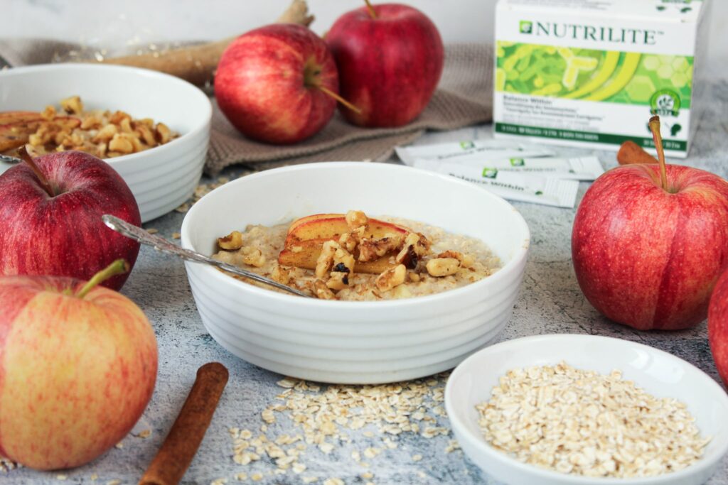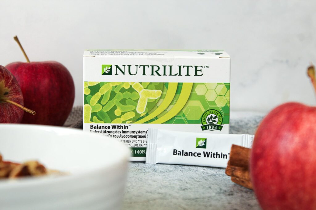 Und so kommen wir wieder zu unserem Porridge mit Nutrilite Balance Within zurück. Das Pulver enthält eine Kombination aus zwei B-Vitaminen, welche die Nerven und Abwehrkräfte stärken. Zudem beinhaltet das Pulver 6 Milliarden Milchsäurebakterien, die den Darm lebend erreichen.