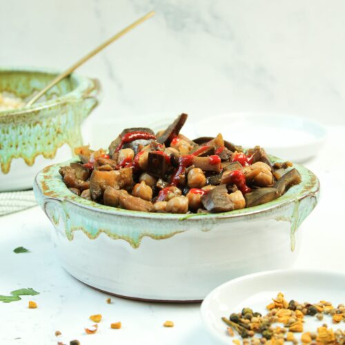 Ich mache zu der veganen Auberginenpfanne gerne Bulgur, um noch etwas Kohlenhydrate in das Gericht zu bringen und sie sättigender zu machen. Du kannst aber auch super Reis oder Couscous dazu servieren, oder die Pfanne einfach so genießen.