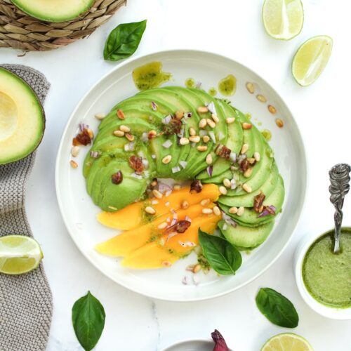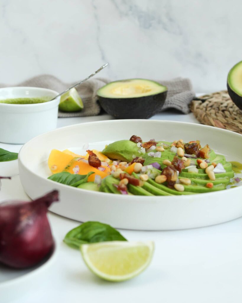 Vegan Essen gehen wird glücklicherweise immer einfacher und auch in nicht veganen Restaurants und außerhalb der hippen Großstadt findest du mindestens eine vegane Option in jeder Speisekarte – im Zweifel Pommes mit Ketchup. Bei Vorspeisen sieht es dagegen eher noch mau aus, schade! Dabei können vegane Vorspeisen so lecker und so einfach sein. Glaubst du nicht? Ich beweise es dir mit meinem Avocado Carpaccio mit Mango und Basilikum-Dressing.