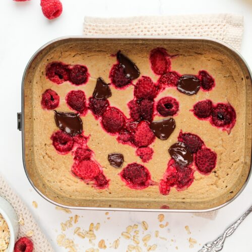 - Nun Haferbrei in eine ofenfeste Form geben und mit Himbeeren und Schokodrops toppen. Bei 180 Grad Umluft (vorgeheizt) 15-20 Minuten backen.