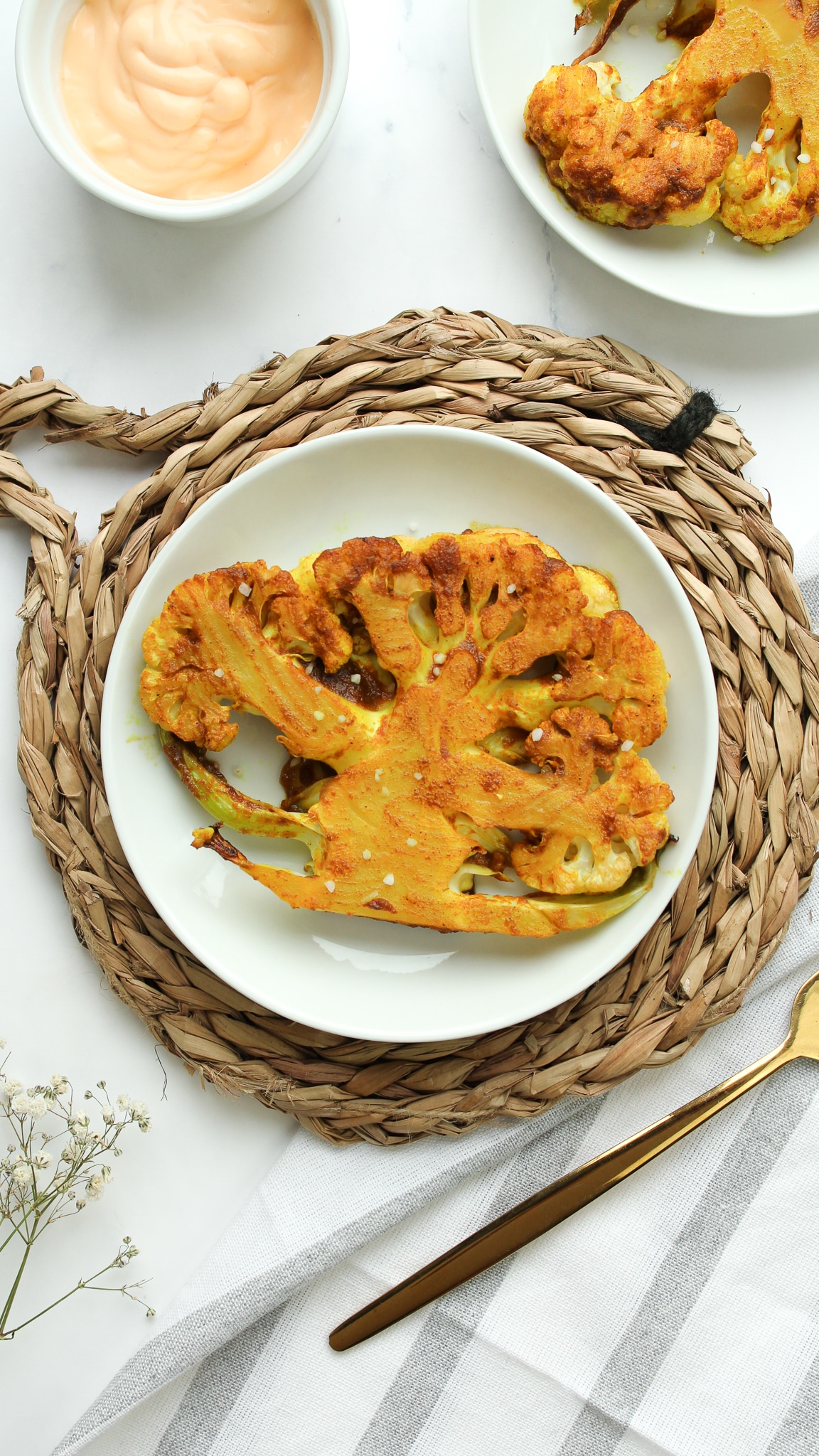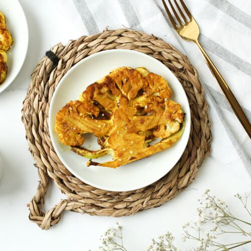 Mein Blumenkohl aus dem Ofen ist nicht nur vegan, sondern eignet sich auch für eine Low-Carb-Ernährung. Blumenkohl hat auf 100 g nur ca. 2 g Kohlenhydrate und ist damit sehr kohlenhydratarm. Der Ofen-Blumenkohl ist deshalb auch toll als leichtes Abendessen geeignet. Wenn du nicht auf Kohlenhydrate achtest, passen Kartoffeln super gut zu den Blumenkohl Steaks. Probier’ das Rezept unbedingt mal aus!