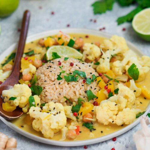 Dieses vegane Blumenkohl Curry mit Kokosmilch ist einfach zubereitet und perfekt, für den Feierabend. In gerade einmal 30 Minuten ist das Gericht fertig auf dem Tisch. Das Curry ist vollgepackt mit buntem Gemüse und proteinreichen Kichererbsen. Dazu serviere ich etwas Naturreis – probiere es unbedingt aus!