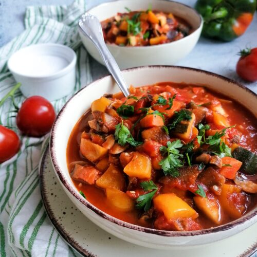 - als nahrhafte und gesunde Mahlzeit, da es mit Paprika, Auberginen, Zucchini und Co. nur so vor Vitaminen und Mineralstoffen strotzt.