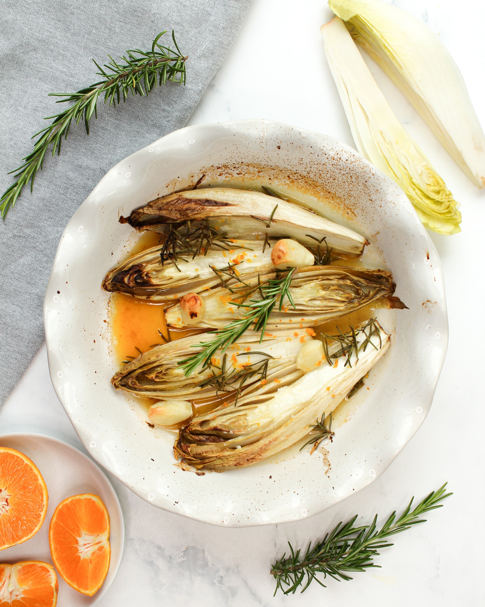 Zu dem leicht bitteren Geschmack des Chicorées passt eine süße Komponente wunderbar. Ich liebe die Kombination aus frischer Orange und Rosmarin und gebe deshalb einfach Orangensaft, Orangenabrieb und Rosmarinzweige mit dem Chicorée in den Ofen. Das herzhafte, leicht bittere Gemüse und die fruchtig frische Vinaigrette ergeben ein super stimmiges Chicorée Rezept aus dem Ofen.