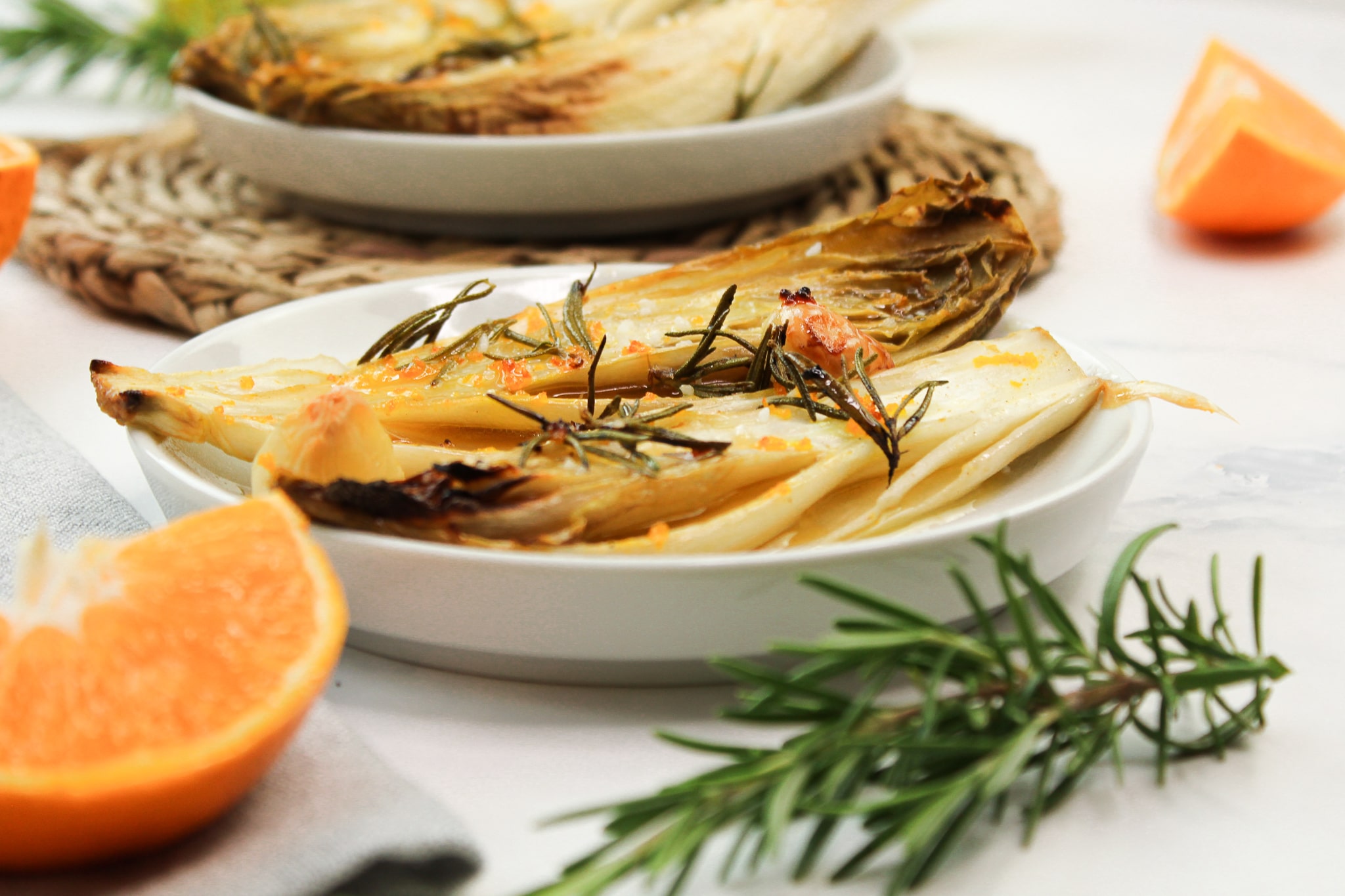 Kennst du Chicorée noch von früher bei Mama mit Hackfleisch und Käse überbacken? Das ist natürlich alles andere als vegan aber ich kann dir versichern: Chicorée lässt sich auch fantastisch als veganes Ofengericht zubereiten. Mit etwas Orangensaft und frischen Kräutern ergibt das leckere Wintergemüse eine tolle Vorspeise.