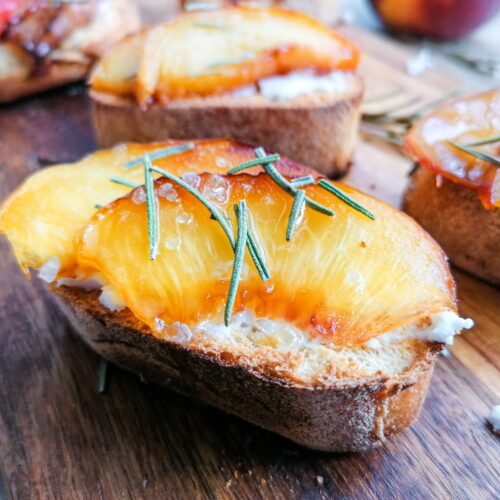 Diese Crostini mit gegrilltem Pfirsich und Ziegenfrischkäse sind das perfekte Rezept für laue Sommerabende. Das Gericht ist in unter 15 Minuten zubereitet und die perfekte Kombi aus süßem Pfirsich und herzhaftem Ziegenkäse. Dazu etwas Rosmarin und Honig und fertig ist dieses schmackhafte Rezept.