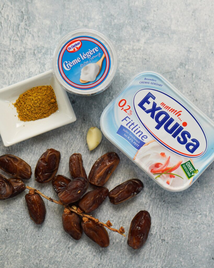 - Frischkäse: Für den Datteldip verwende ich besonders kalorienarmen Frischkäse mit nur 0,2% Fettanteil.