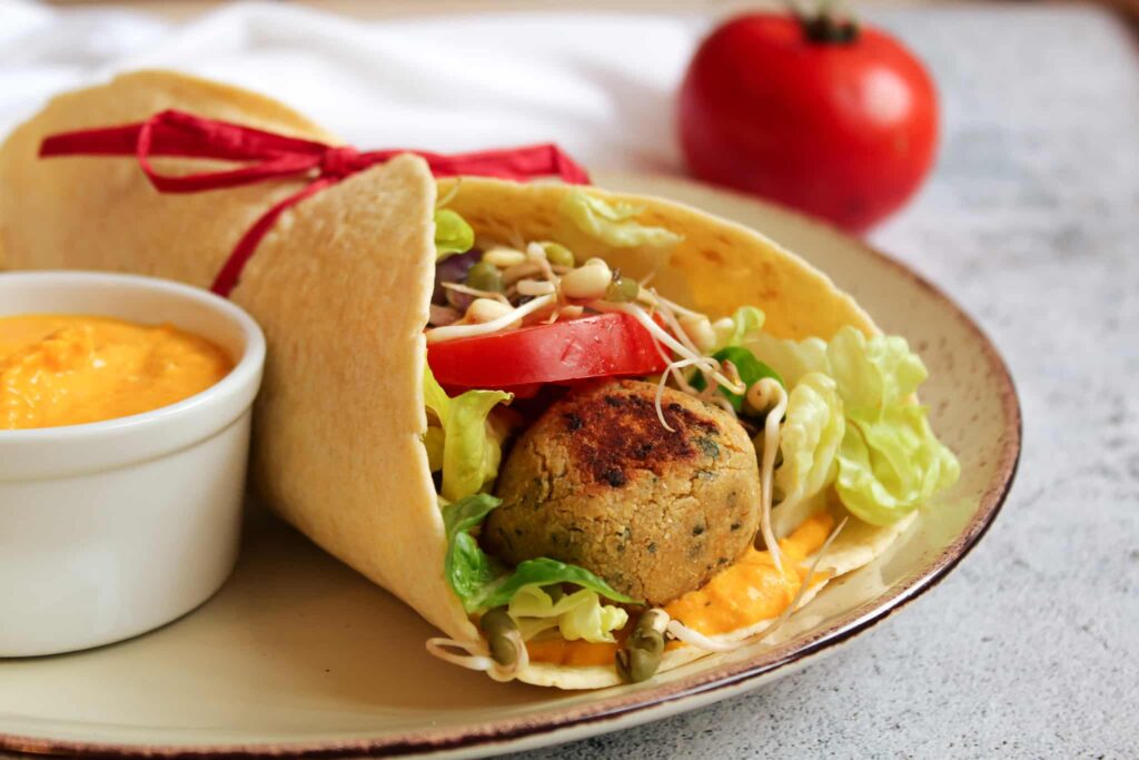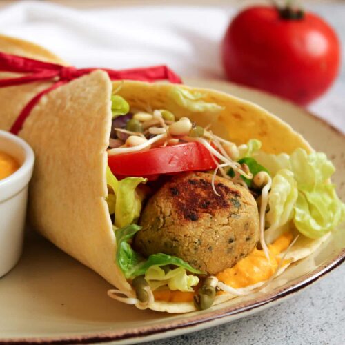 Wenn es mal schnell gehen muss, ist dieser Falafel Wrap mit Hummus perfekt. Hummus sowie Falafel lassen sich bereits vorab vorbereiten und dann ist der Wrap in unter 5 Minuten fertig. Hummus lässt sich außerdem beliebig abwandeln. So kannst auch ein paar Erbsen oder Kürbis dazu geben und gibst dem Hummus somit eine besondere Note. Der Wrap lässt super als Meal-Prep Gericht verwenden. So kannst du ihn einfach zusammenrollen und für unterwegs mitnehmen oder am Abend nach der Arbeit genießen :).