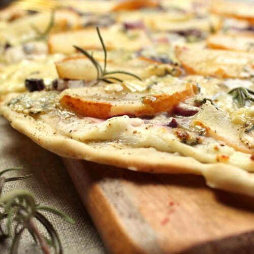 Lust mal was neues zu probieren? Wie wäre es mit diesem leckeren, vegetarischen Flammkuchen mit Birne, Gorgonzola, Honig und frischem Rosmarin. Die Kombination aus der fruchtigen Birne, Gorgonzola, dem süßen Honig und dem salzigen Gorgonzola schmeckt wirklich unfassbar lecker – perfekt als Snack für laue Sommerabende oder einen gemütlichen Abend mit Freunden. Das Flammkuchen Rezept ist natürlich beliebig abwandelbar und durch andere Zutaten ersetzbar.