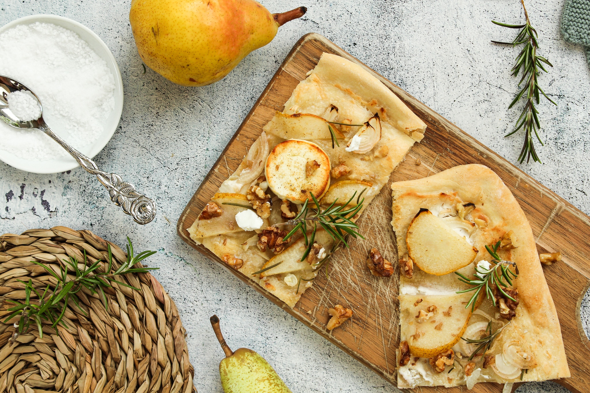 Flammkuchen mit Birne, Ziegenkäse und Walnüssen