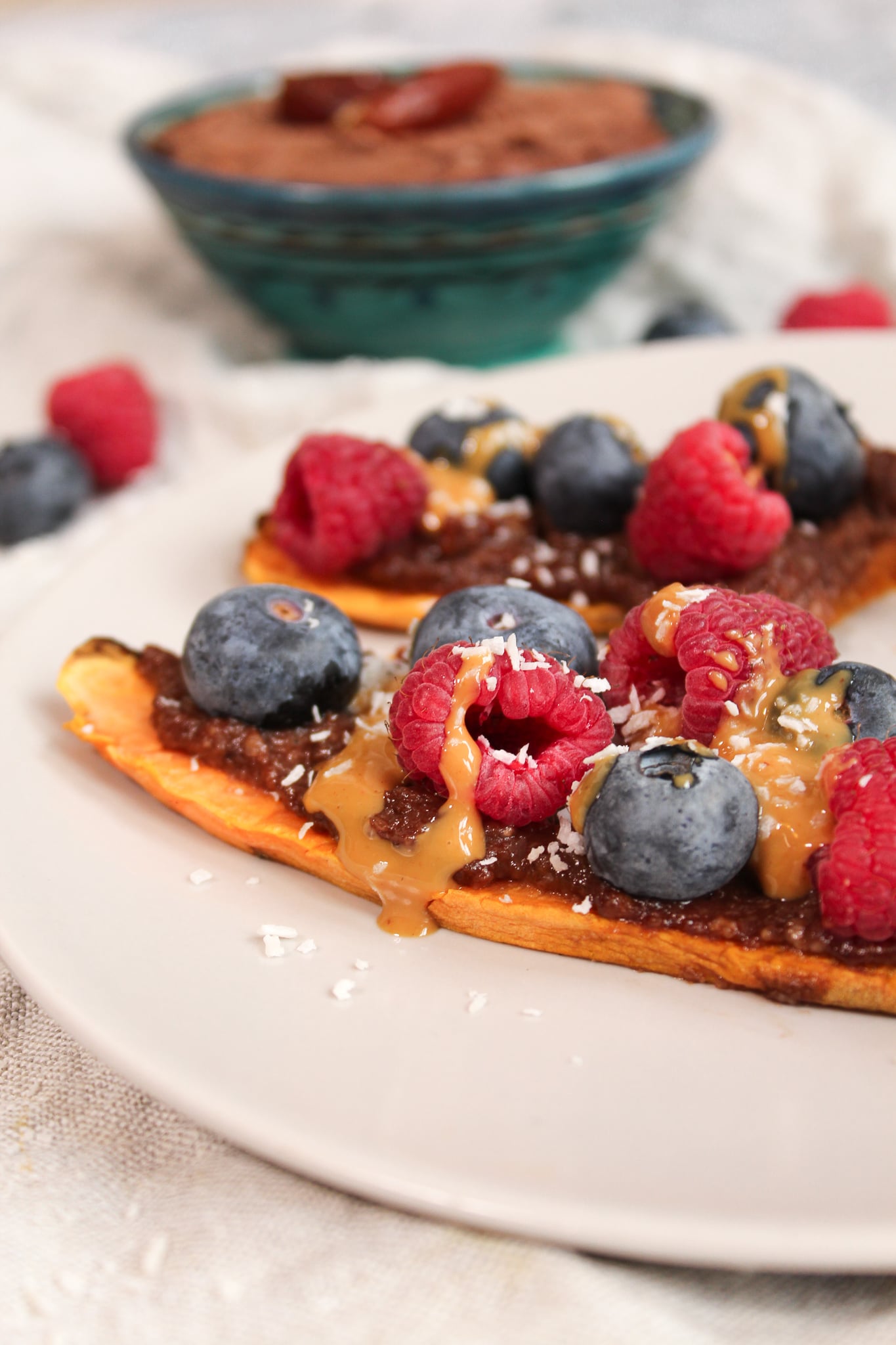 Süßkartoffel getoastet mit Früchten und Schokocreme
