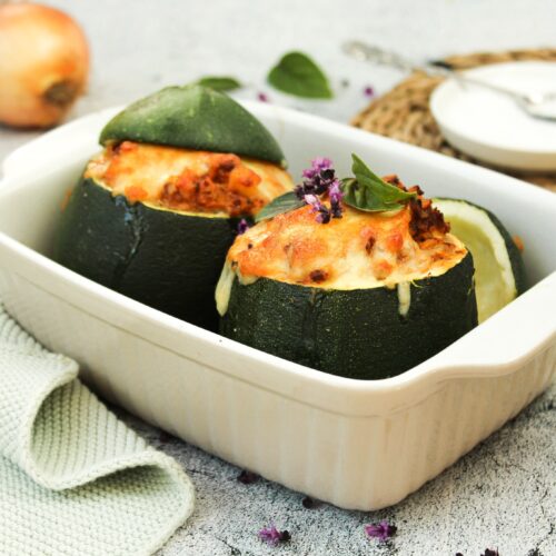 Für cremige Soßen brauchst du nicht immer Sahne. Für diese gefüllte Zucchini, die vegetarisch ist, mache ich gerne eine frische Tomatensoße und vegetarischem Hack aus Soja. Am liebsten verwende ich als Fleischersatz Soja Granulat aus der Kühltheke. Mittlerweile ist die Auswahl an gute Ersatzprodukten wirklich riesig – du findest mit Sicherheit eines, dass dir schmeckt.
