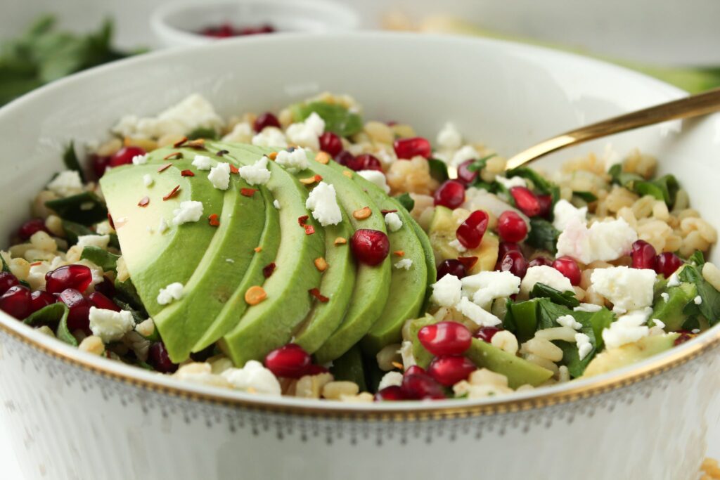 Eigentlich passt fast alles in diesen Salat. Je mehr verschiedene Gemüse, Kräuter und sogar Früchte beigemischt werden, um so spannender wird Deine Kreation. Hier stelle ich einen sommerlichen Salat vor, den ich mit Granatäpfelkerne, Avocado, Feta, Frühlingszwiebeln, Minze und Petersilie kombiniere. Die Minze bildet dabei einen frischen Gegensatz zu den anderen Zutaten. Kichererbsen passen ebenfalls ausgezeichnet und können ebenfalls hingefügt werden.