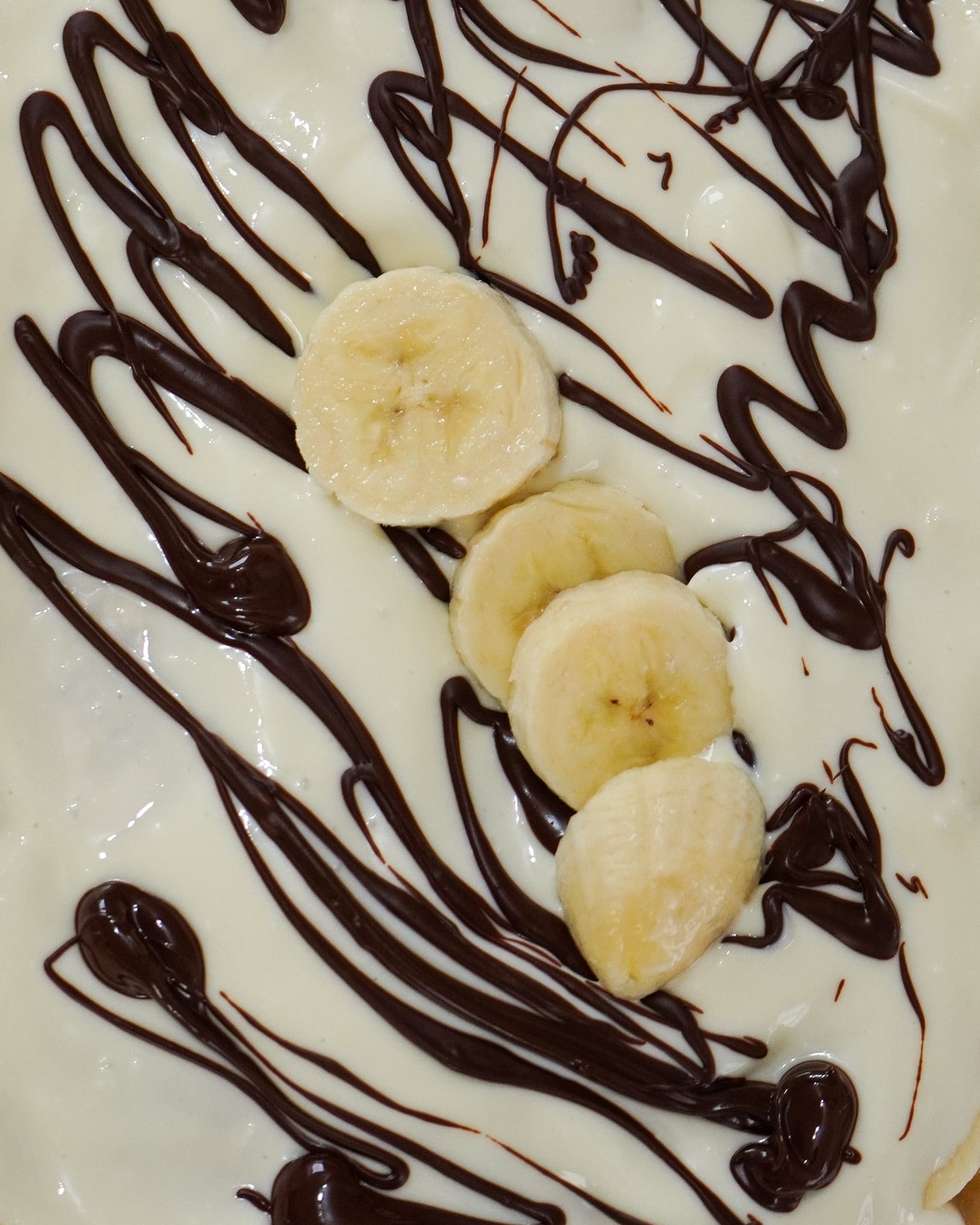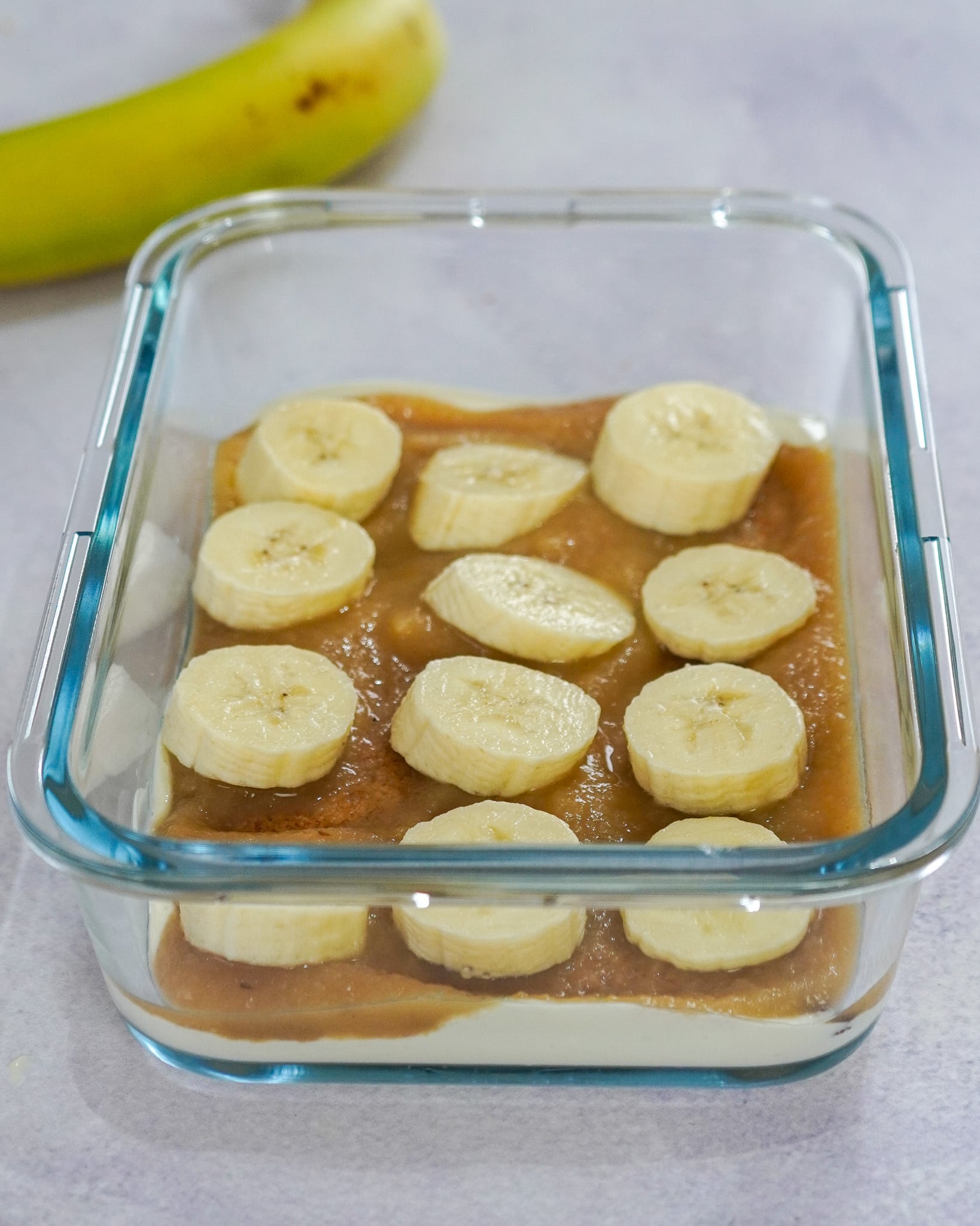 - 3. Schicht: Die geschnittenen Bananenstücke gleichmäßig auf den Keksen verteilen.