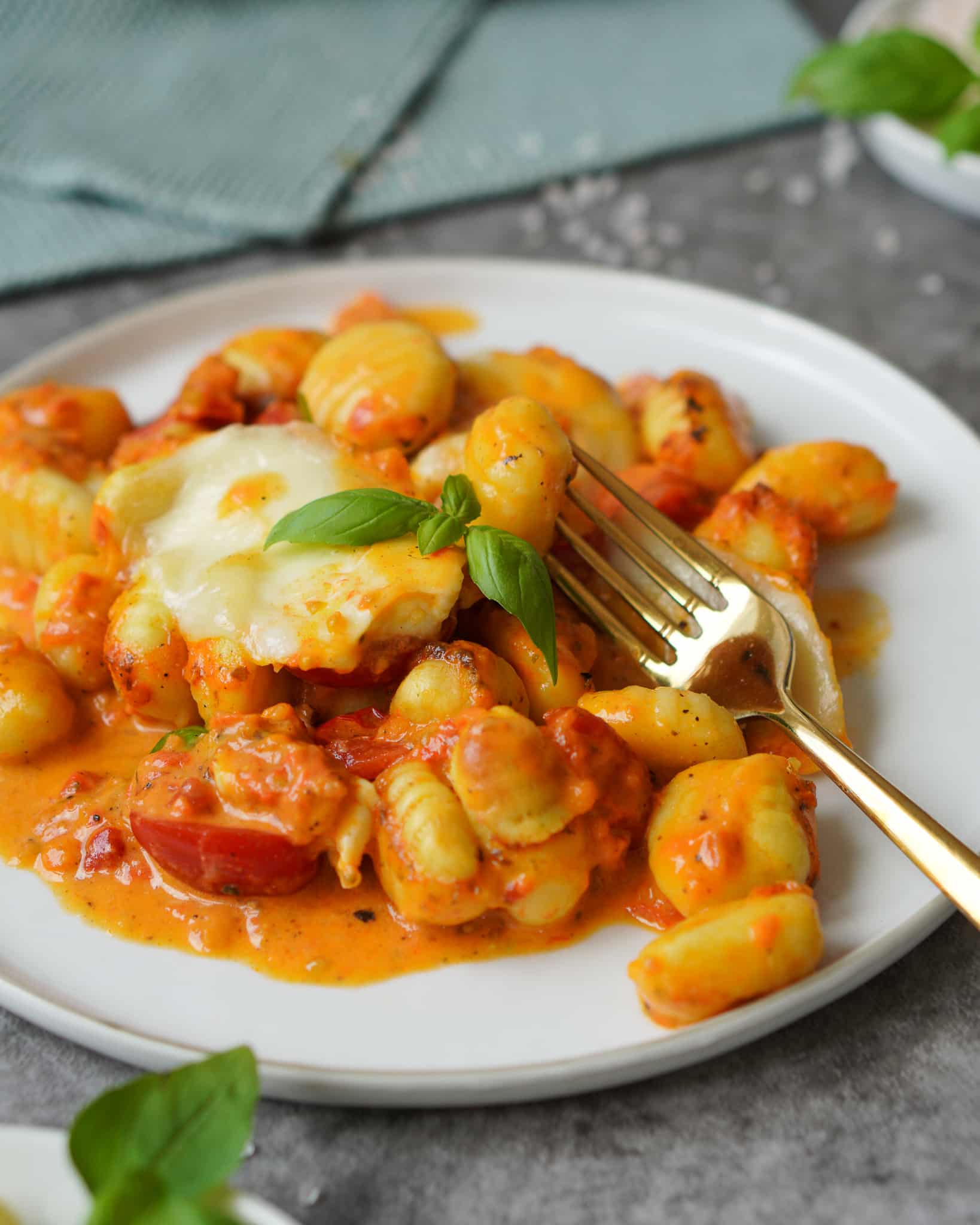 - Mozzarellascheiben auf den Gnocchi verteilen und im Ofen bei 180 Grad (vorgeheizt) 25 Minuten überbacken.