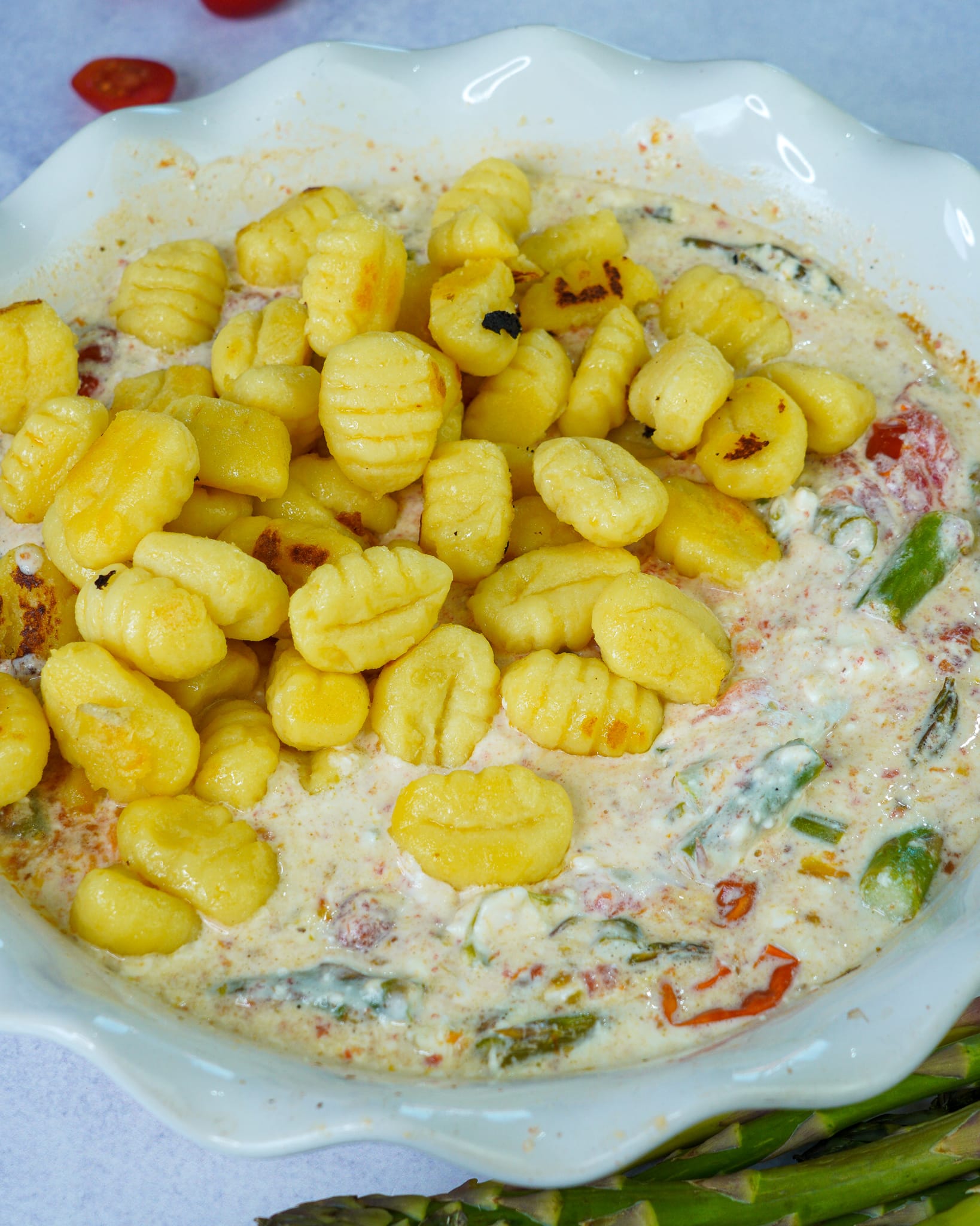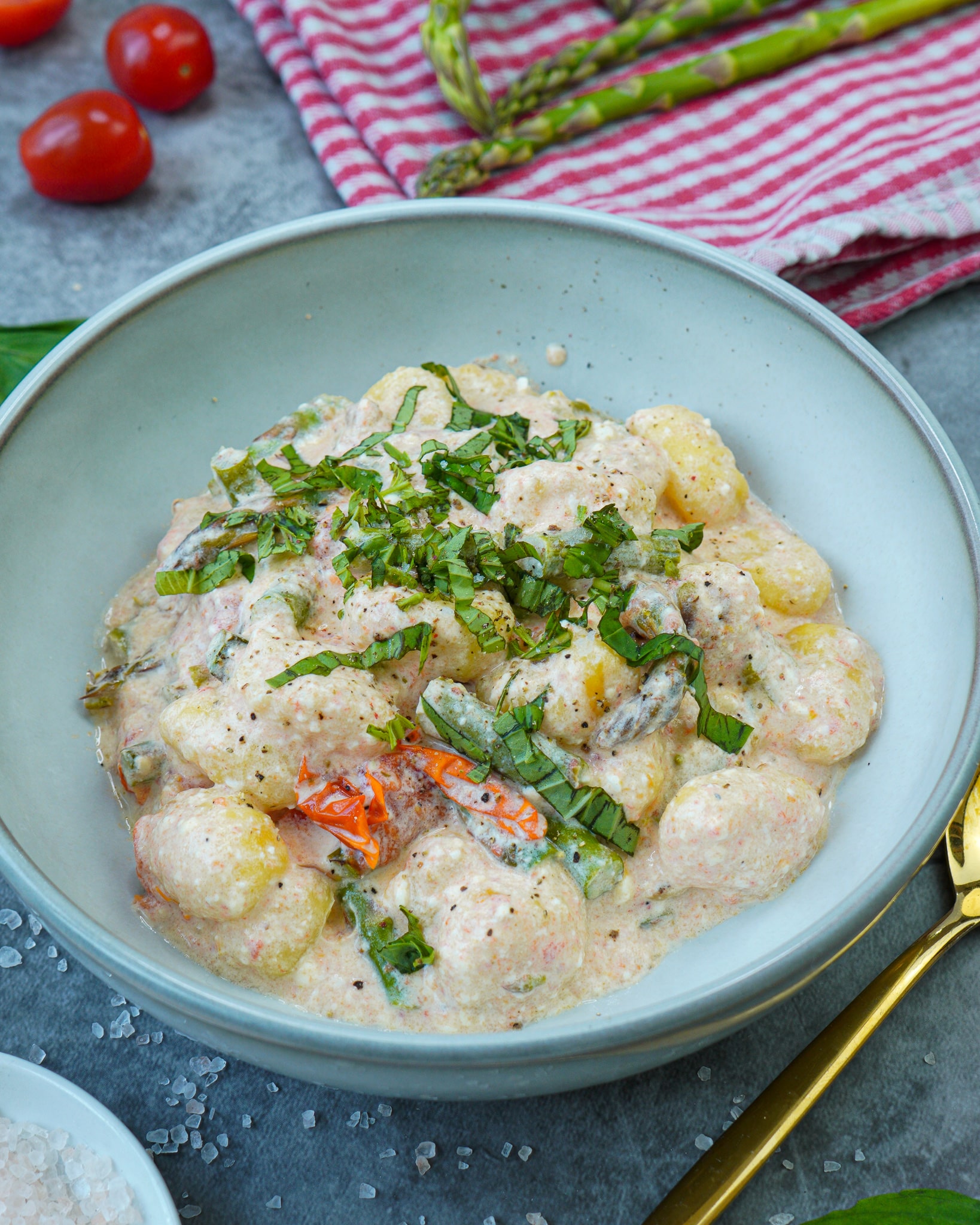 Gnocchi mit grünem Spargel, Tomaten und Feta