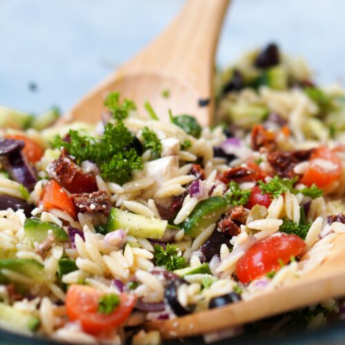 Dieser leckere und gesunde vegane Nudelsalat aus frischem Gemüse, Kritharaki Pasta (oder Orzo), Oliven und Feta erfreut sich sowohl als Beilage für ein Picknick, als auch als Partyteller immer größerer Beliebtheit. Ohne viel Arbeit zuzubereiten, ist diese köstliche griechische Spezialität in weniger als 15 Minuten fertig!