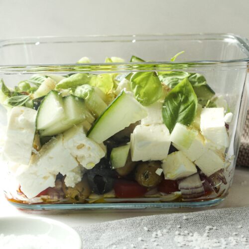 Das Dressing für griechischen Salat ist so einfach, wie es nur sein könnte. Wenn ich alle Zutaten miteinander vermengt habe, gebe ich einfach nur etwas Olivenöl an den Salat – that’s it! Die frischen Zutaten schmecken so schon so lecker und der Feta und die Oliven bringen eine richtig angenehme Würze in den griechischen Salat, sodass sogar Salz überflüssig ist. Wenn du gerne noch eine leichte Säure an den Salat bringen möchtest, kannst du das mit einem Spritzer Zitronensaft oder etwas Balsamico Essig super hinbekommen.