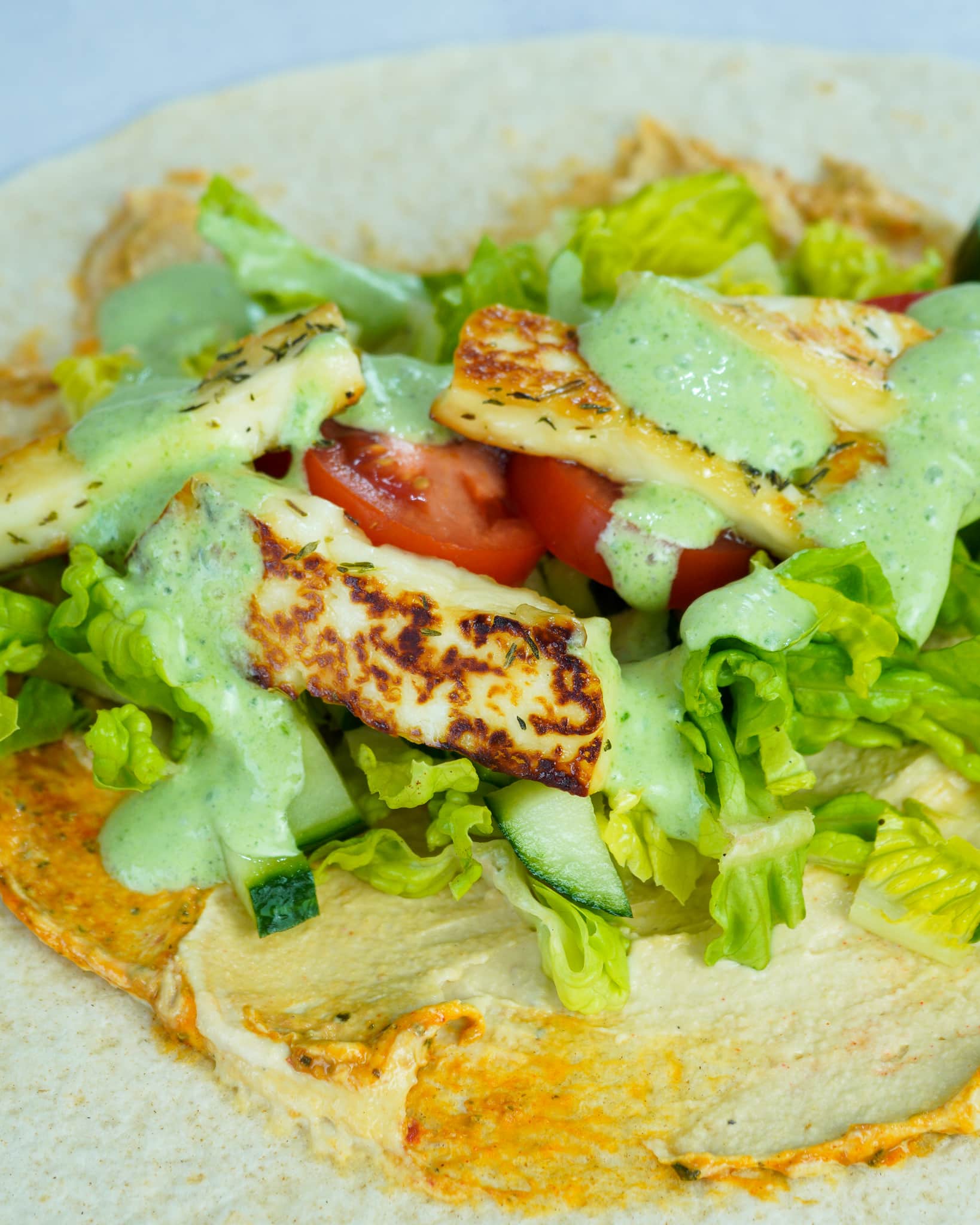 - Die Vollkorn-Tortillas auf einer sauberen Arbeitsfläche ausbreiten.Jeweils 1 EL Hummus in der Mitte der Tortillas verstreichen.Jeweils ein paar Salatblätter, Tomatenscheiben und Gurkenscheiben darauflegen.Den gebratenen Halloumi auf das Gemüse legen.Die Kräutersoße gleichmäßig auf den beiden Wraps verteilen.