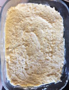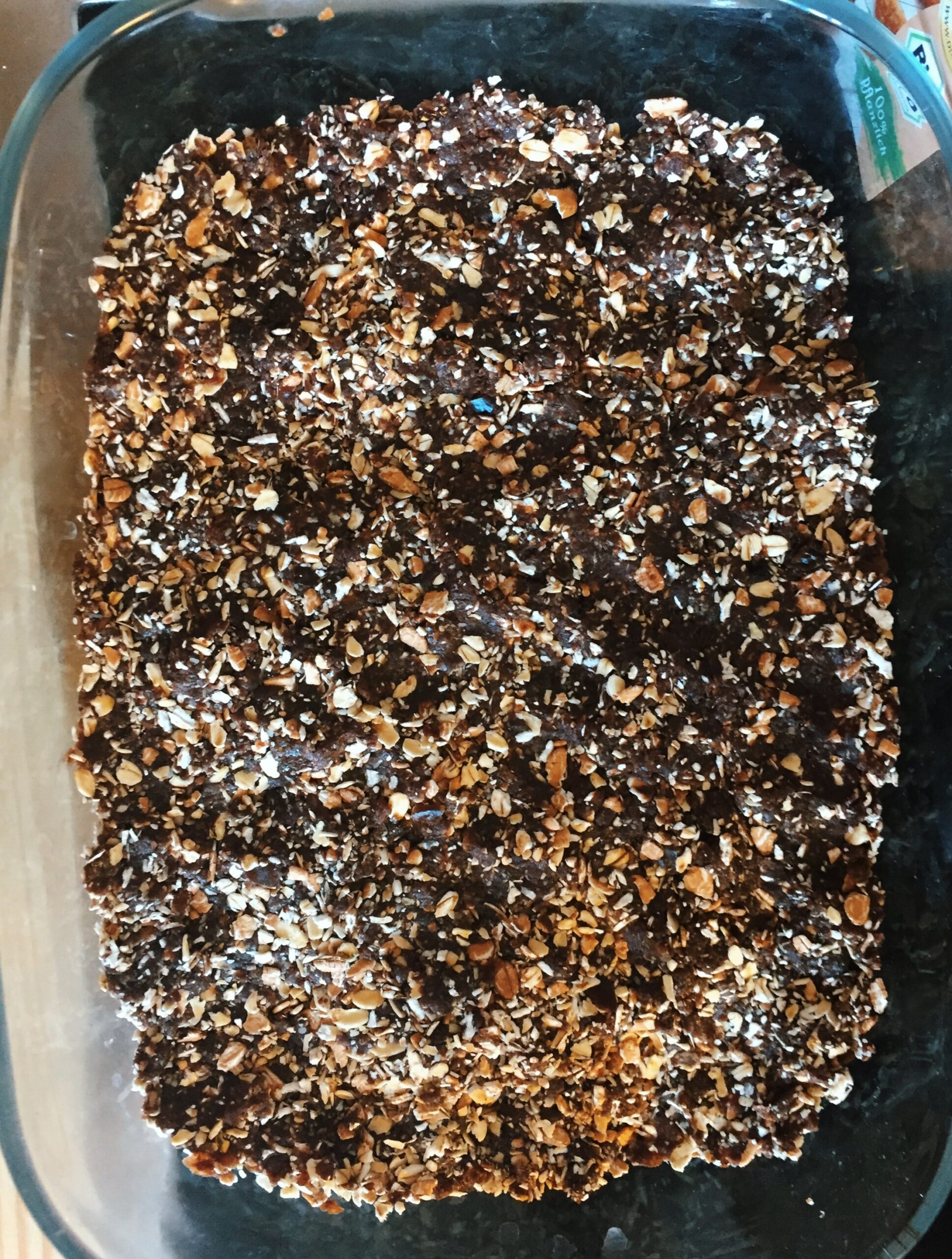 Datteln, Haferflocken, Rosinen, Mandelmuß und Kakaopulver in einen Standmixer geben und zu einem Teig verarbeiten. Falls die Masse etwas zu fest ist, kann ein klein wenig Wasser hinzugefügt werden. Den Teig anschließend in eine kleinen Auflaufform geben und glatt streichen.