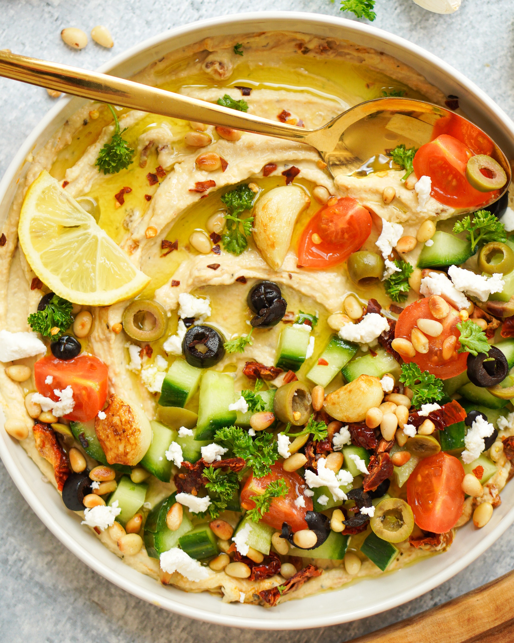 - Zusammen mit der Petersilie, den frischen und getrockneten Tomaten, den Gurken, dem Feta und den Oliven gleichmäßig auf dem Hummus verteilen. Mit Olivenöl beträufeln und Feta darüber bröseln.