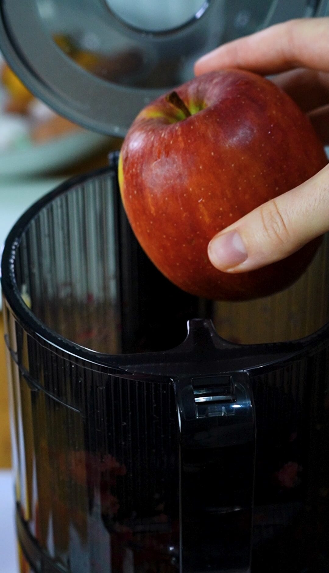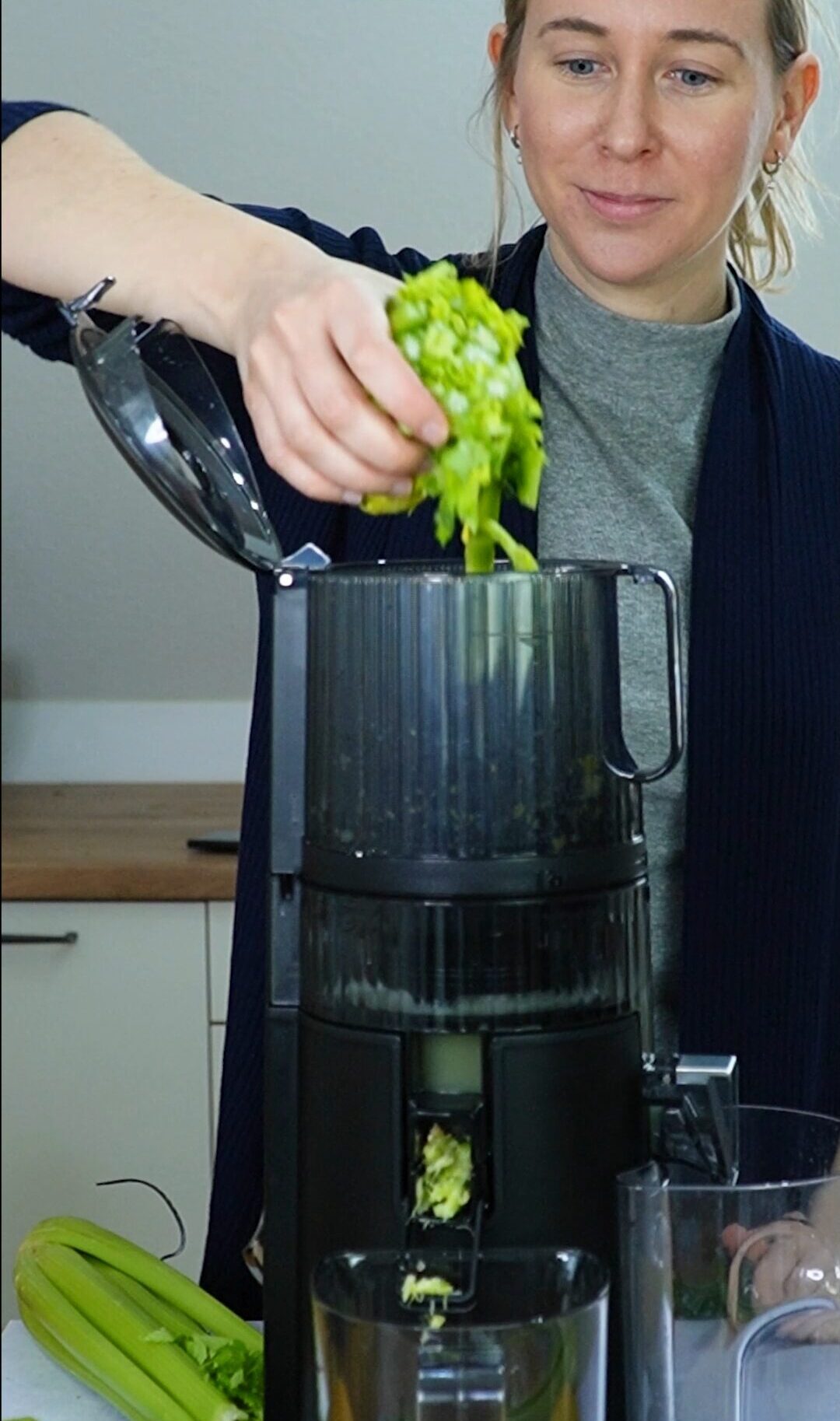 Hier kommt mein absoluter Lieblingsvorteil: Ich kann endlich ganze Äpfel entsaften, ohne sie vorher zu zerschneiden! Der breite Einfüllschacht macht das Entsaften so viel einfacher und schneller. Auch Sellerie, Karotten oder Ingwer wandern einfach im Ganzen rein – ein echter Zeitgewinn, gerade morgens, wenn es schnell gehen muss.