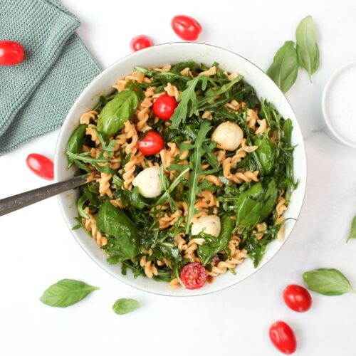 Die Sonne kommt raus, die Temperaturen steigen und es ist endlich wieder Zeit zu grillen! Suchst du noch den perfekten Nudelsalat zum grillen? Dann bist du hier genau richtig. Mein italienischer Nudelsalat mit Tomaten und Rucola ist viel leichter als der klassische deutsche Nudelsalat mit Mayo und damit einfach perfekt für warme Sommerabende. Für den Salat nutze ich gerne frische Cherrytomaten. Du kannst das Rezept aber auch ganz einfach umwandeln und daraus einen Nudelsalat mit getrockneten Tomaten und Rucola machen. Wenn du getrocknete Tomaten für den Salat benutzt, kannst du das Öl, in dem die Tomaten eingelegt sind, ganz toll für dein Dressing verwenden. Du kannst aus dem Grundrezept auch einen italienischen Salat mit Pesto machen und dafür grünes oder rotes Pesto als Dressing verwenden. Probier’ aber unbedingt auch meine Version des Salats, die schmeckt wirklich jedem! 🙂