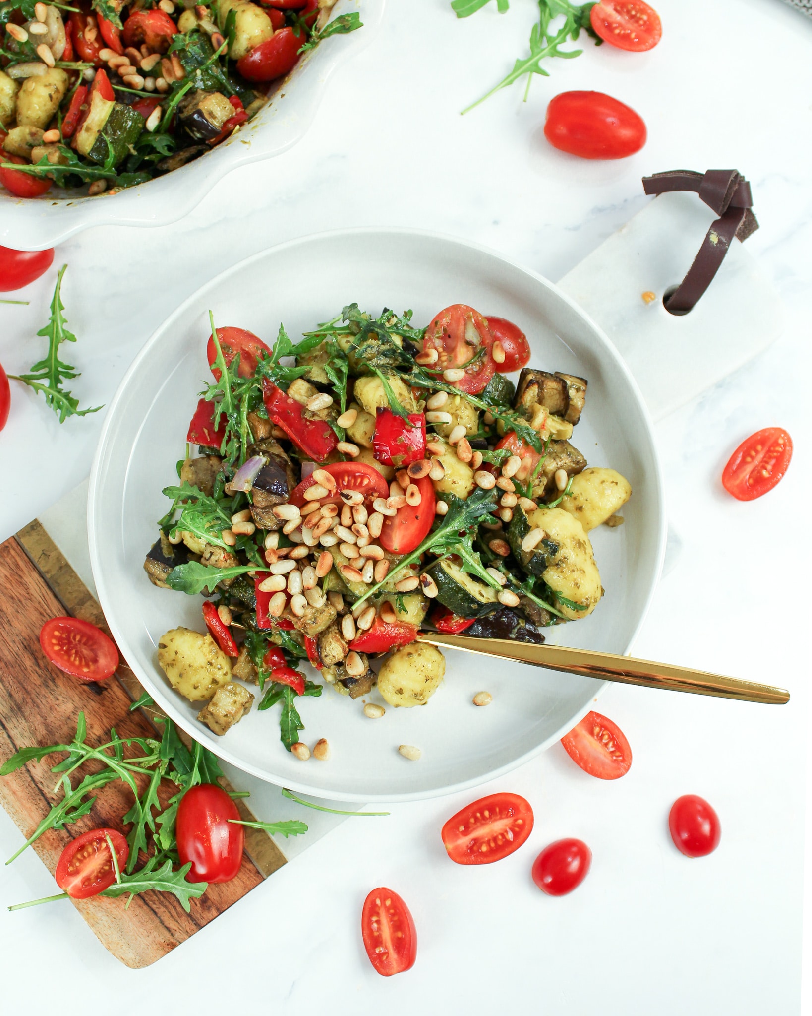 - Gemüse aus dem Ofen holen und in eine große Schüssel geben. Gnocchi sowie Tomaten, Zwiebel und Rucola dazu geben und alles miteinander vermengen. Dressing sowie Pesto darüber geben und unterheben.