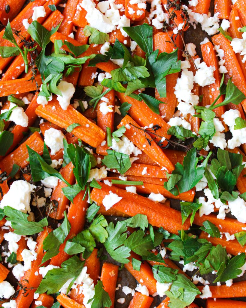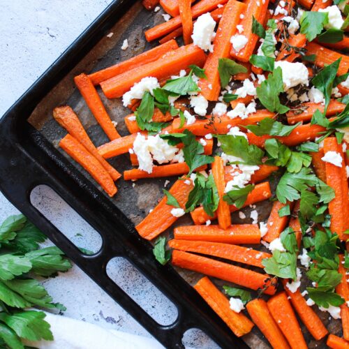 - Karotten aus dem Ofen holen und Feta sowie Petersilie darüber streuen.