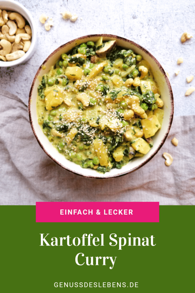 Kartoffel mit Spinat ist eine geniale Mischung. Der etwas herbe Spinat verbindet sich super mit weichen Kartoffel in einem Kokosmilch-Curry. Cashewnüsse geben der Soße zusätzliche eine cremige Substanz, die auf der Zunge zerkläuft.