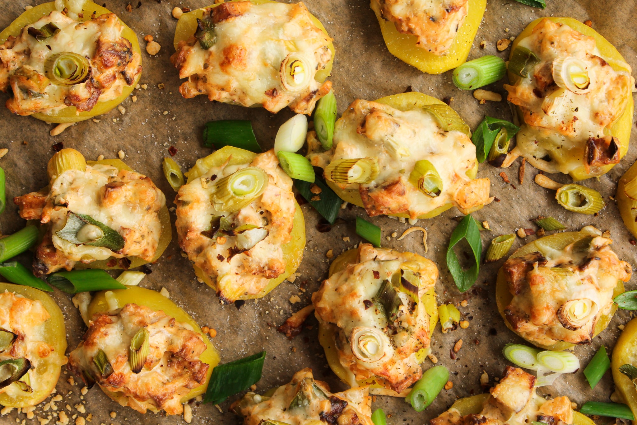 - Die Masse auf die Kartoffelscheiben verteilen und mit dem restlichen Gouda und Frühlingszwiebel bestreuen.