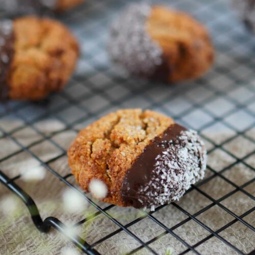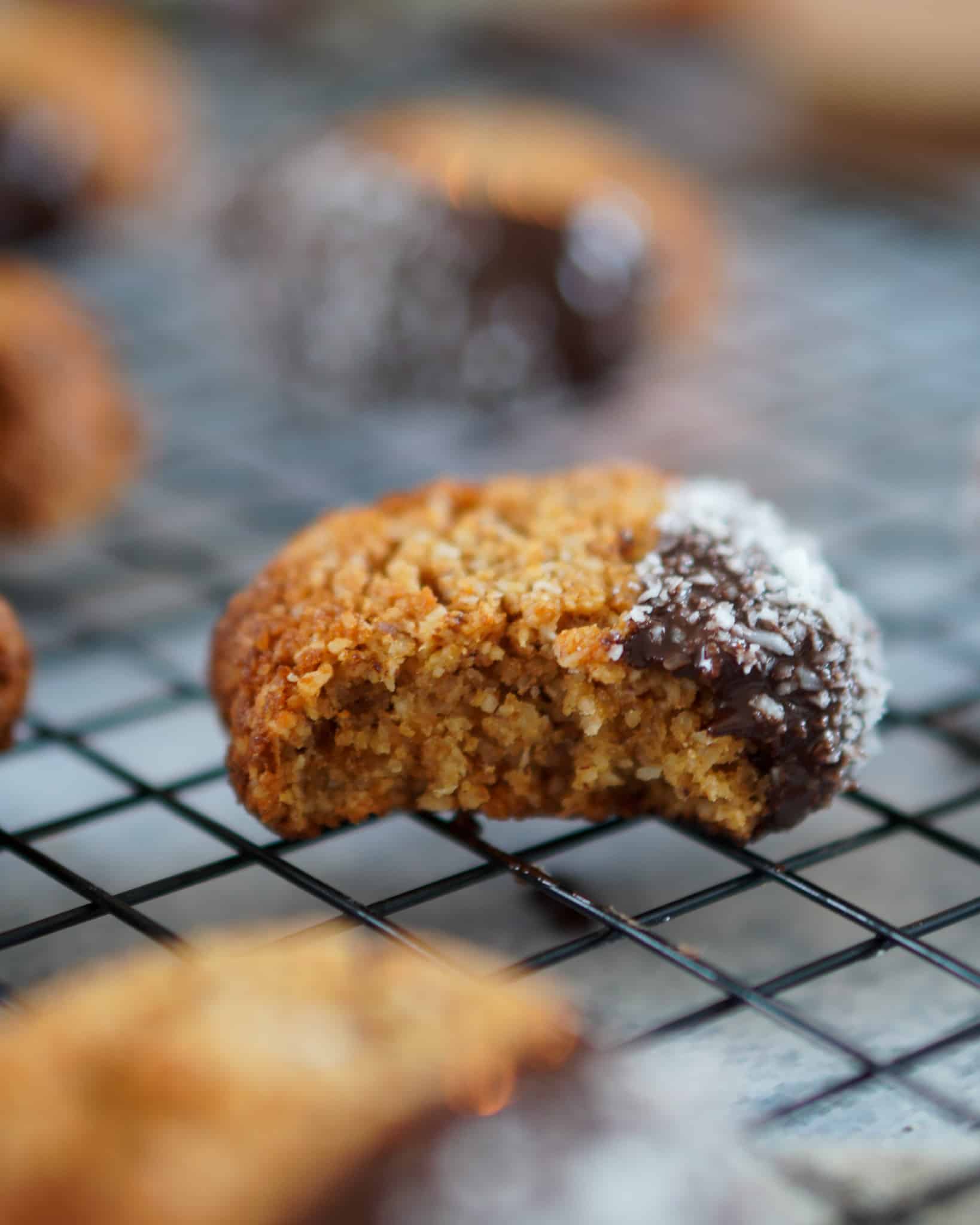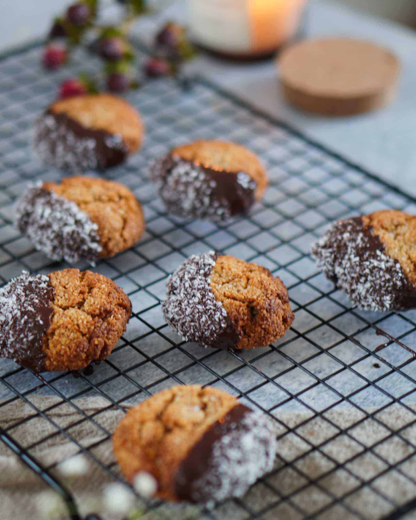 - Plätzchen abkühlen lassen und geschmolzener Schokolade und Kokosraspeln verzieren.