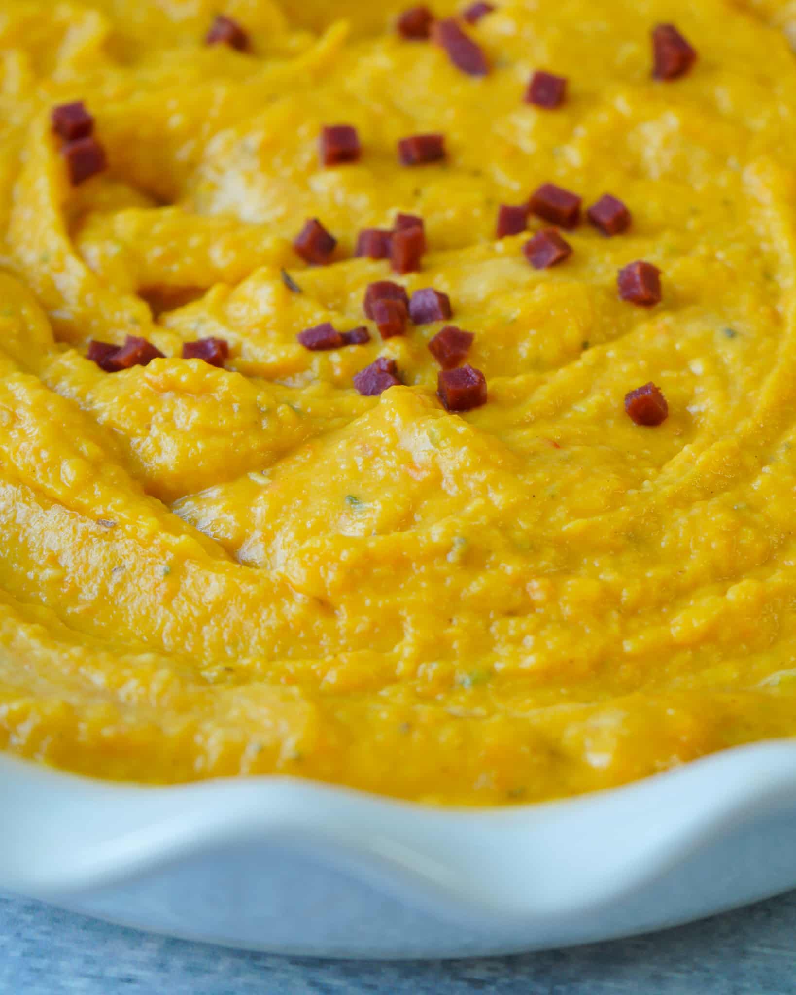 - Gesund und ausgewogen: Kürbis ist eine gesunde und nährstoffreiche Zutat. Er liefert Vitamin A, Ballaststoffe und andere wichtige Nährstoffe. Zusammen mit Gemüse und veganem Speck bietet dieses Gericht eine ausgewogene Mahlzeit.