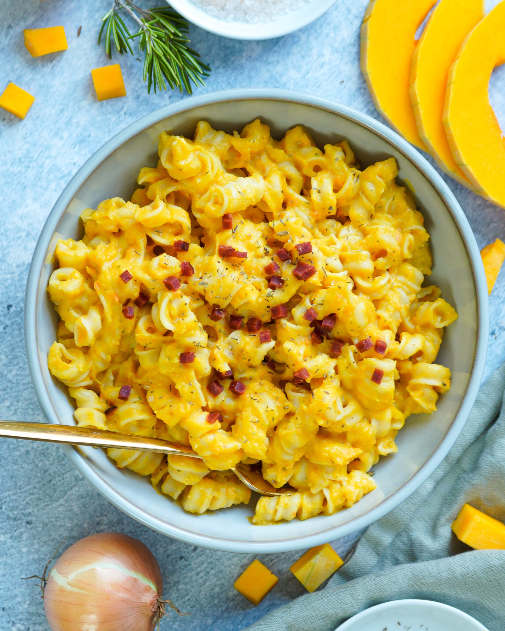 - Herbstliche Gemütlichkeit: Mit dem Butternut-Kürbis als Hauptzutat bringt dieses Gericht den herbstlichen Charme auf den Teller. Die süße und nussige Note des Kürbisses verleiht der Pasta ein warmes und gemütliches Aroma, das perfekt zur Jahreszeit passt.