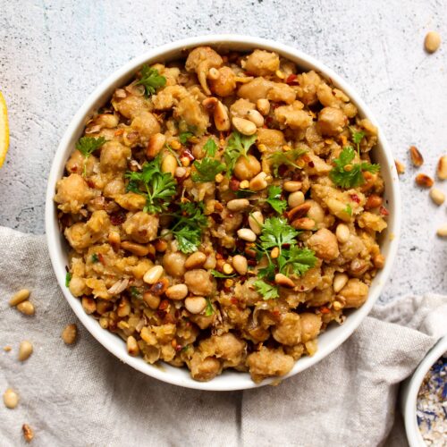 - In einer weiteren Pfanne werden die Pinienkerne angeröstet. Danach unter die Kichererbsen heben und mit den Gewürzen abschmecken. Am Schluss wird der Salat mit gehackter Petersilie verfeinert.
