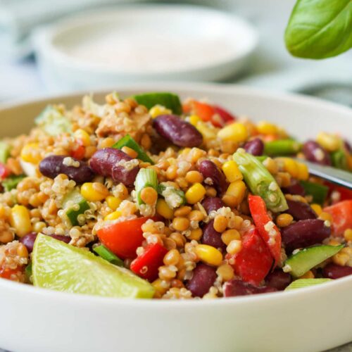 Dieser proteinreiche Hülsenfrüchte Salat ist perfekt als Meal Prep oder als Beilage zum Grillen geeignet.