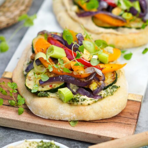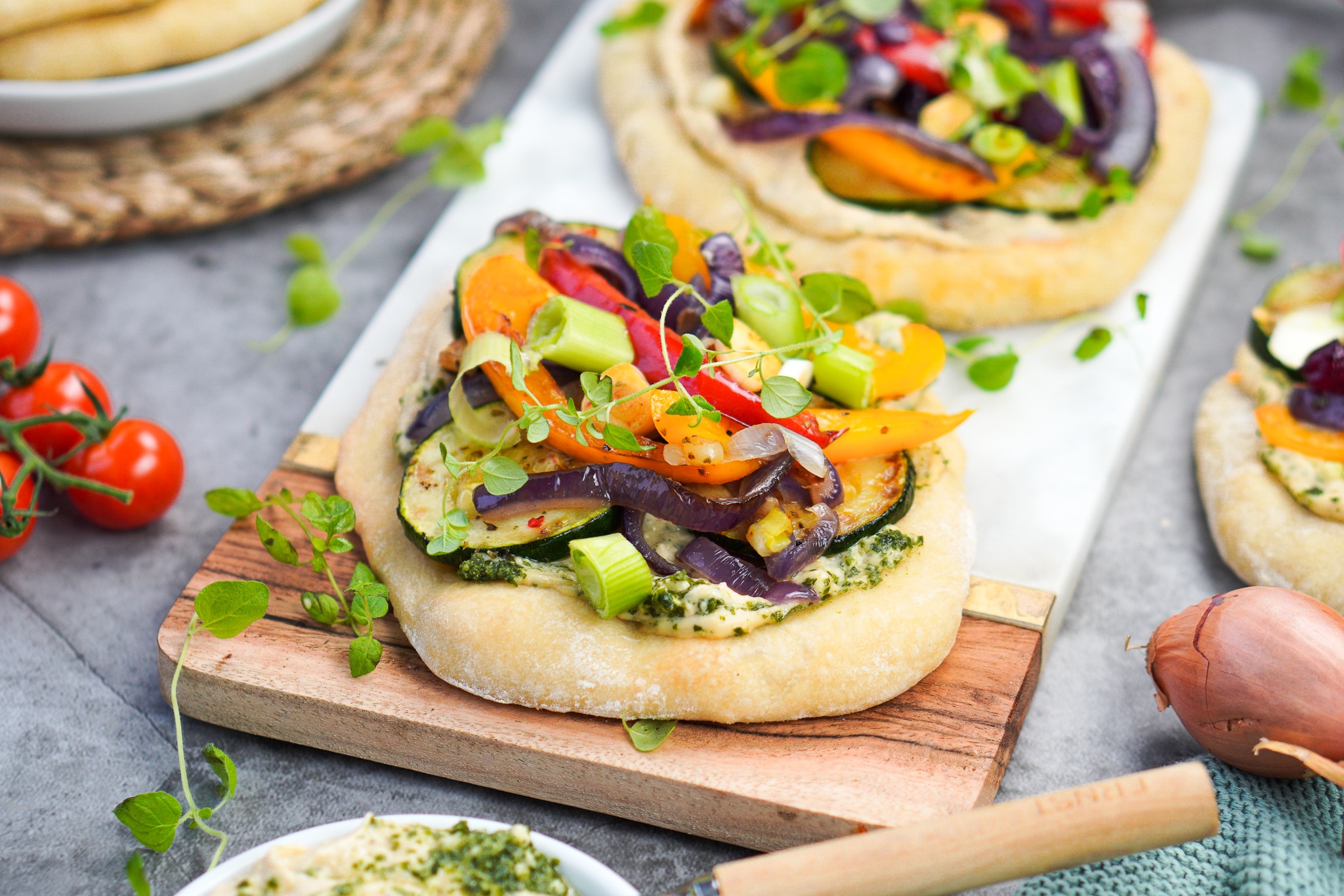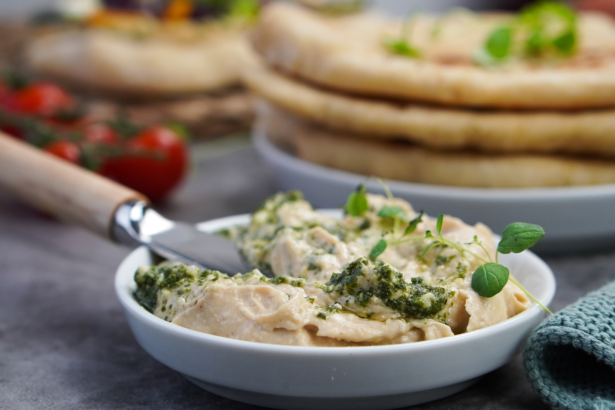 - Für das Rezept „Grillgemüse auf Pita Brot“ brauchst du außerdem Hummus. Entweder nimmst du fertigen aus dem Supermarkt oder du machst ihn einfach selbst 😊. Ein leckeres Rezept für Hummus findest du hier.Zudem habe ich etwas Pesto unter dem Hummus gemischt, das passt perfekt zu diesem Gericht.