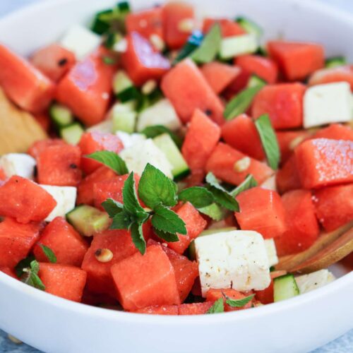 Dieser fruchtige Melonen Feta Salat ist perfekt für heiße Sommertag. Er ist kühlend, kalorienarm und schnell zubereitet. Du benötigst du dafür nur 10 Minuten und 4 Hauptzutaten. Klingt klasse oder? Probier den Wassermelonen Salat auf jeden Fall einmal aus, du wirst ihn lieben!
