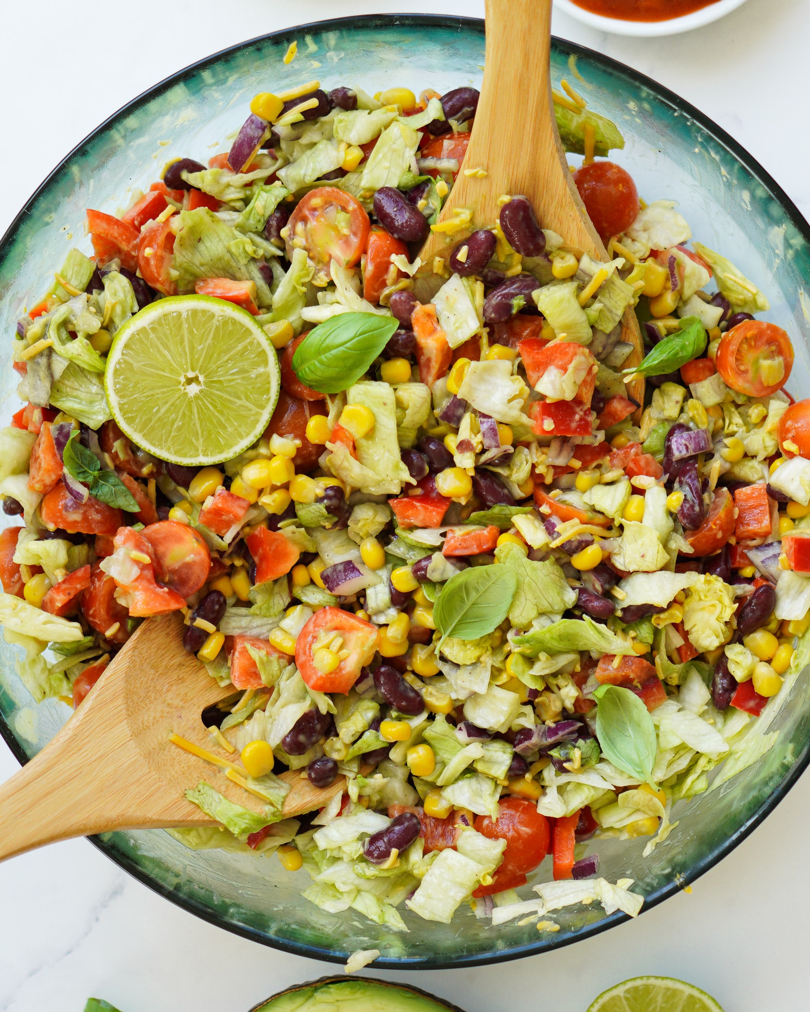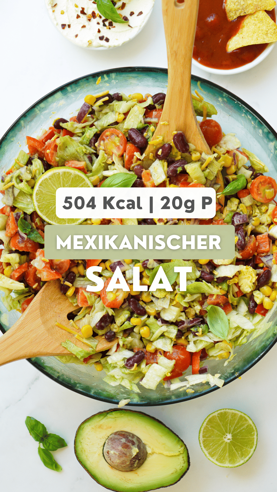 Als Dressing verwende ich ein veganes super cremiges Avocado Dressing – ich bin mir sicher: Das wirst du lieben! Als Topping habe ich ein paar Tortilla Chips, etwas Creme Fraiche und Salsa darauf verteilt. Die genauen Mengenangaben und das Rezept findest du weiter unten. Du kannst du Salat übrigens auch sehr einfach vegan zubereiten. Dafür einfach die Creme Fraiche durch veganen Schmand ersetzen und den Käse weglassen oder durch veganen Käse ersetzen.
