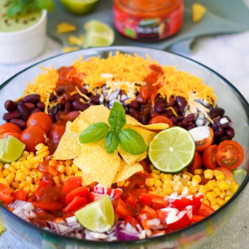 Dieser vegetarische Taco Salat aus Kidneybohnen, Mais, Avocado, roter Paprika, Eisbergsalat, Cherry-Tomaten und Tacos ist superlecker und äußerst gesund. Auch als Nacho Salat bekannt ist er auf jeder Party ein voller Erfolg. Hier zeige ich dir wie du den Tortilla Salat ganz einfach selber machen kannst.