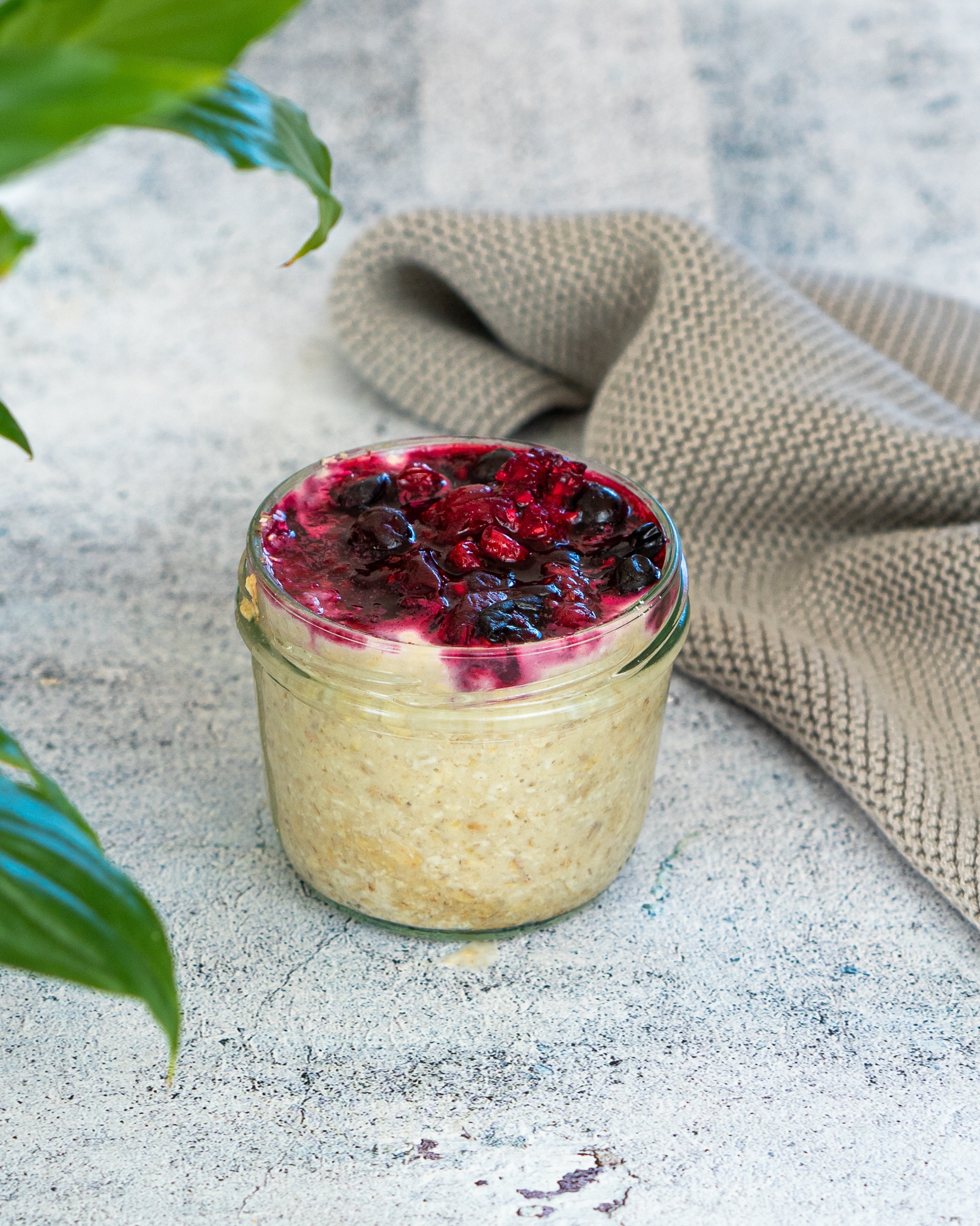 - Fruchtpüree auf den Haferflocken verteilen und für mindestens 1 Stunde, besser über Nacht im Kühlschrank quellen lassen.
