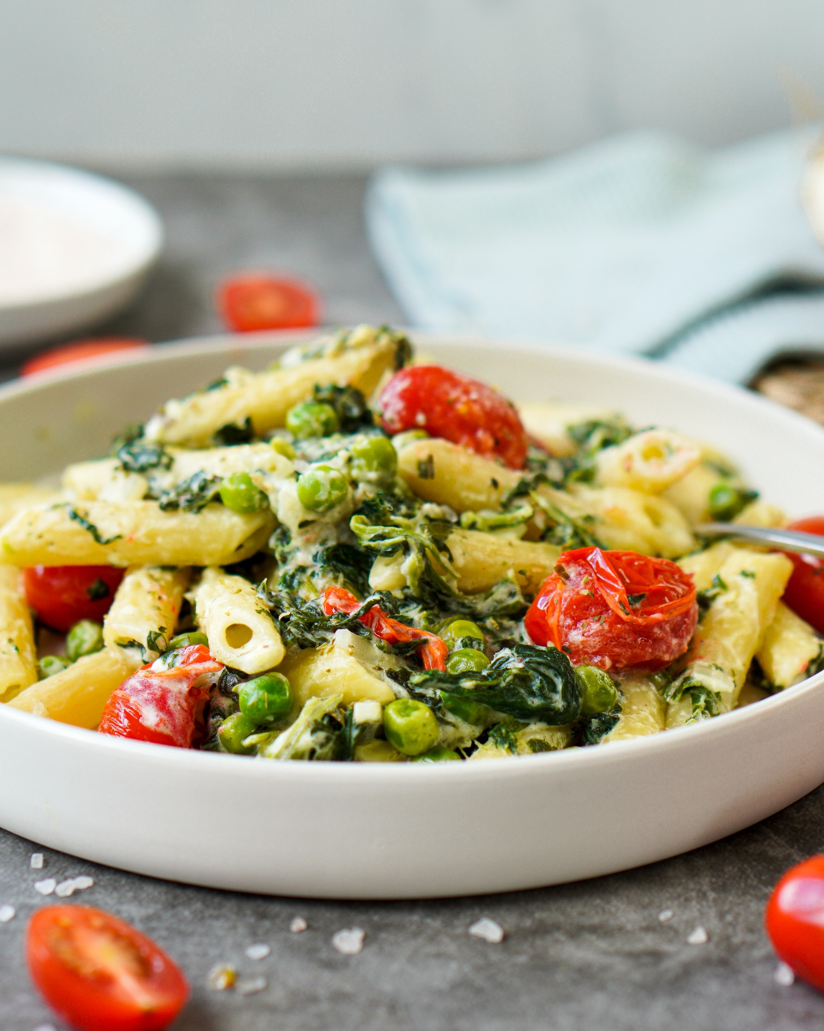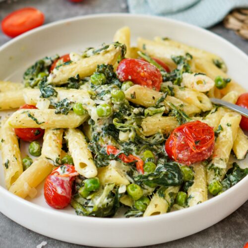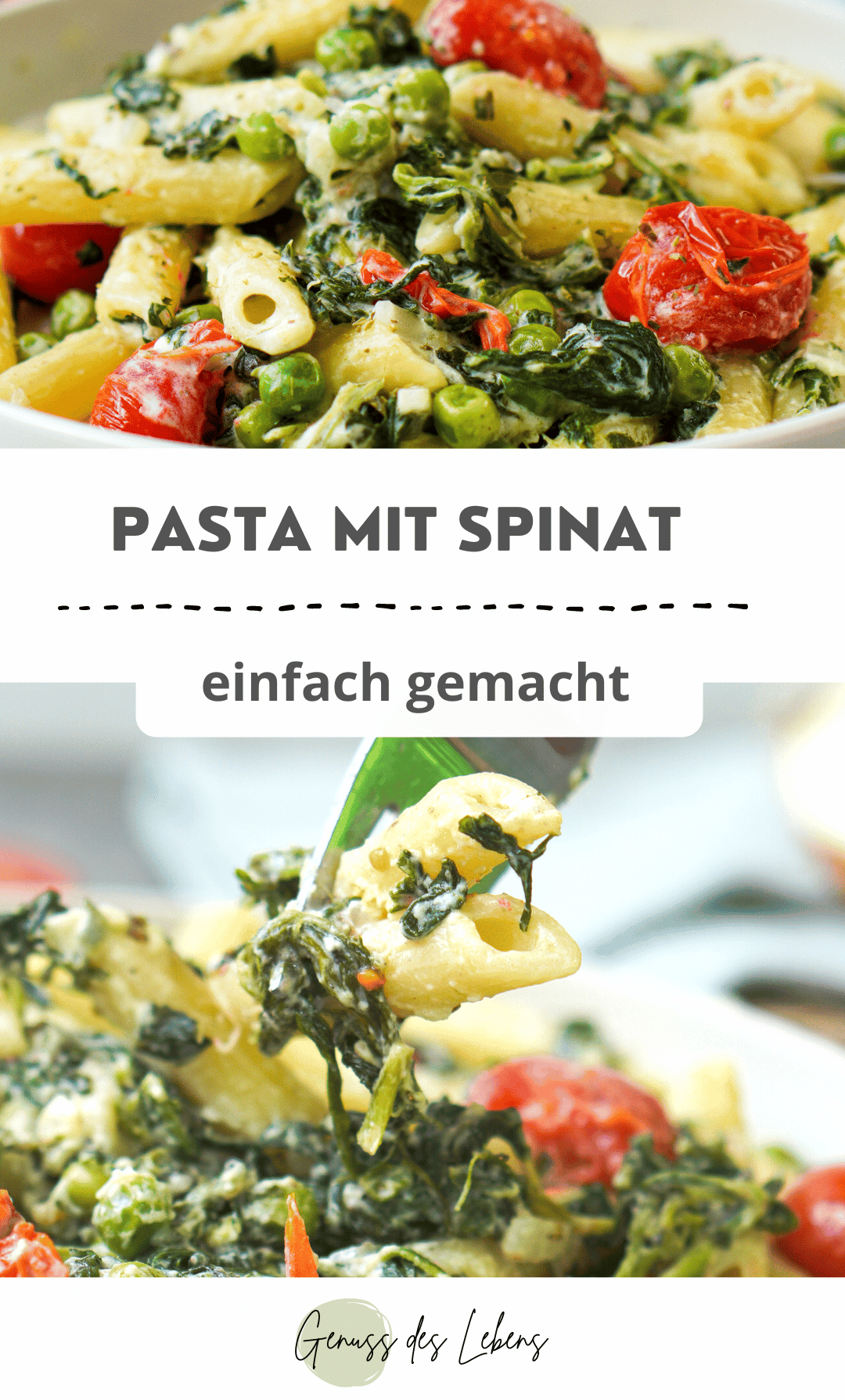 Nicht immer habe ich Zeit zum kochen, aber trotzdem lege ich viel Wert auf eine ausgewogene Ernährung. Deswegen liebe ich dieses Nudelgericht. Es ist schnell und ohne viel Arbeit zubereitet und enthält neben zahlreichen Vitaminen und Eiweiß auch Kalium, Magnesium und Eisen. Die herzhafte Soße aus Fetakäse und Spinat-Tomaten-Erbsen-Gemüse ist wunderbar cremig und dank dem Feta leicht und gut bekömmlich. So ist dieses Gericht für mich auch beim Abendessen immer wieder eine Option. Ich wähle normalerweise Penne-Nudeln für dieses Gericht, aber gerne kannst du hier ein bisschen variieren und eine andere Nudelsorte ausprobieren. Sehr gut eignet sich auch Pasta aus roten Linsen.