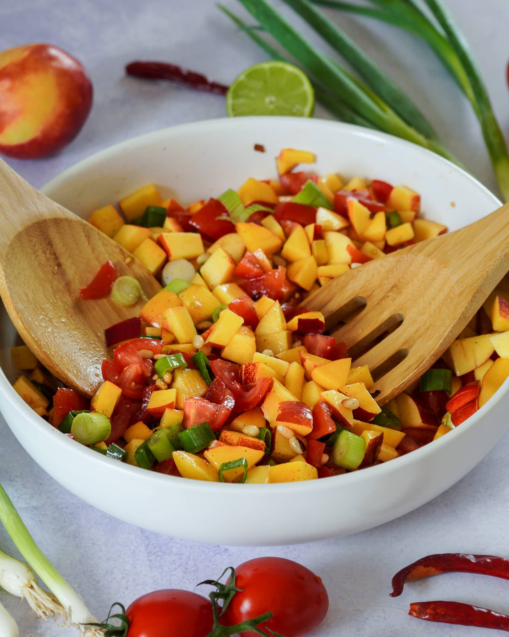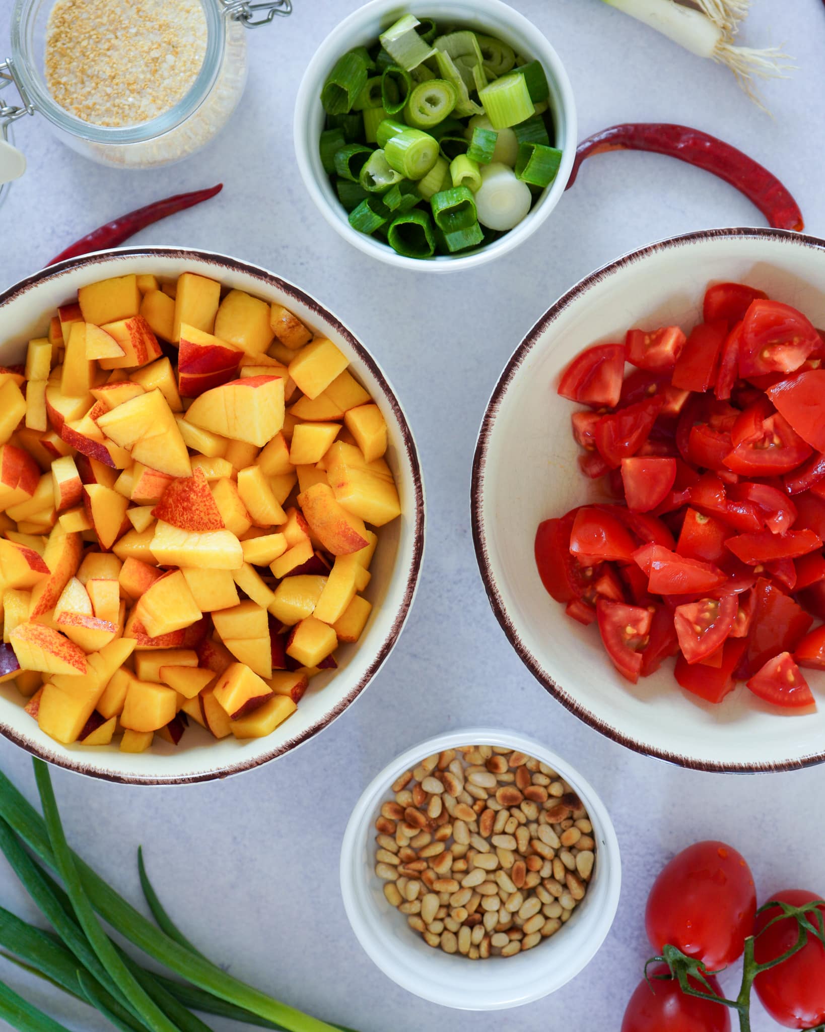 - Die Pfirsiche und die Tomaten waschen und würfeln.