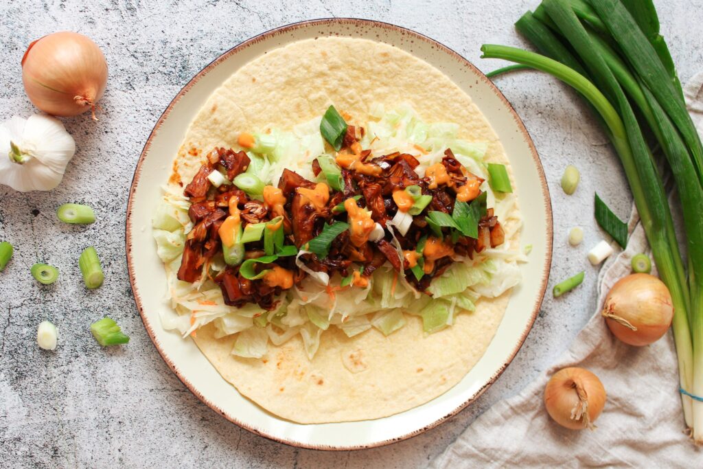 - Alle Zutaten auf dem Tortilla Wraps verteilen und zu einem Wrap einrollen.