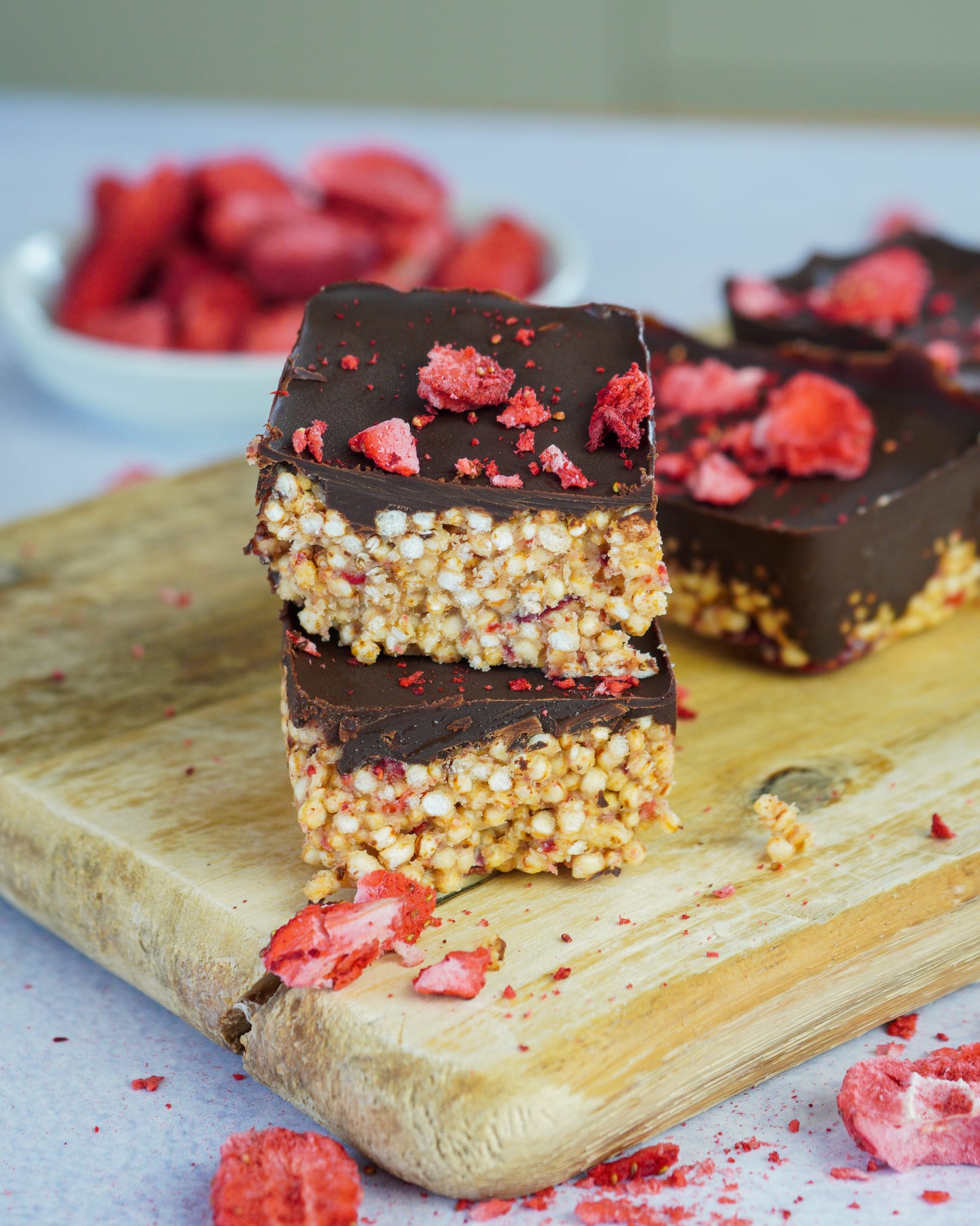 Die gepufften Quinoa-Erdbeer-Schoko-Riegel sind eine köstliche, gesunde Snack-Optio, die einfach zuzubereiten ist und ganz ohne industrielle Zutaten auskommt. Das Rezept insgesamt 8 Riegel.