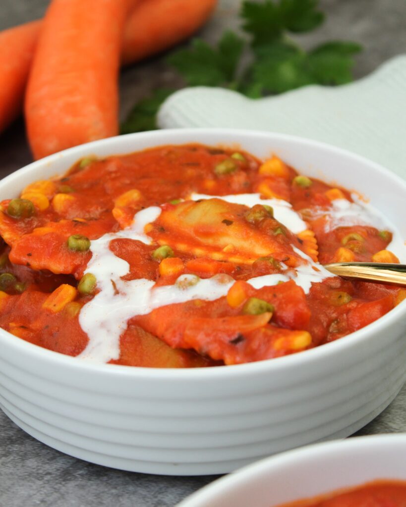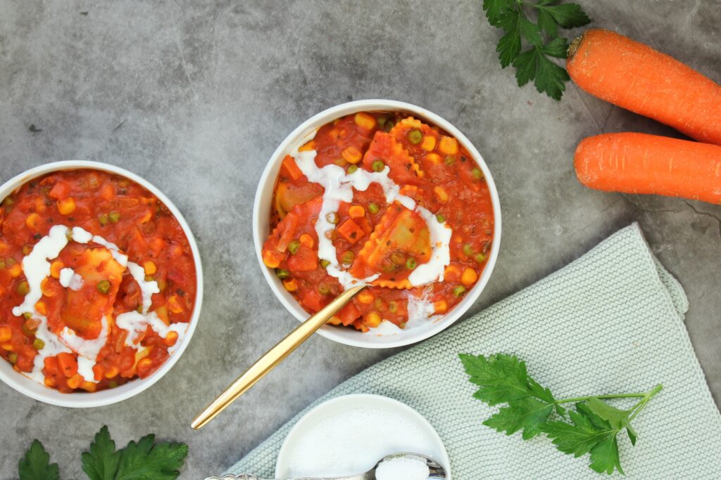 Das beste an den Ravioli in Tomatensoße ist natürlich, dass du nur einen Topf dazu brauchst – es ist also eine One Pot Pasta. Für das Rezept musst du einfach nur alle Zutaten zusammen in einen Topf werfen und warm werden lassen. Die Zwiebel und die Karotte brätst du dabei als erstes an und gibst die flüssigen Zutaten und das andere Gemüse dann nach und nach dazu. Je nach Belieben kannst du die Ravioli vorher in Wasser kochen, oder sie in der Soße mitkochen lassen, bis sie gar sind.