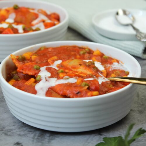 Diese Ravioli in Tomatensoße versetzen dich zurück in deine Kindheit. Mal wieder richtig Lust auf den Geschmack von klassischen Dosenravioli? Das geht auch ohne Dose und ist trotzdem genau so einfach – und auch noch vegetarisch. Für meine vegetarischen Ravioli mit Tomatensoße brauchst du nur wenige Zutaten, einen Topf und 15 Minuten Zeit. Die Tomatensoße für die Ravioli verfeinere ich gerne noch mit etwas Gemüse, wie z.B. Erbsen aber abgesehen davon, aber sonst wirst du geschmacklich ganz sicher an die gute alte Ravioli-Dose erinnert. Ich sag schon mal guten Appetit! 🙂