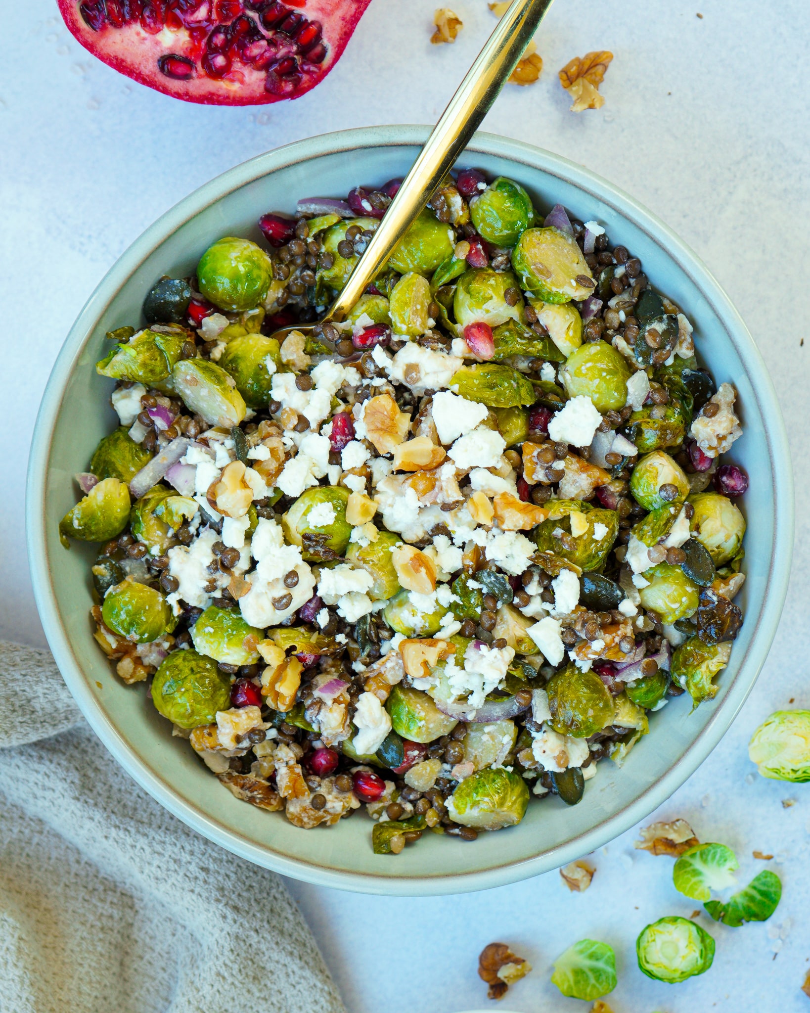 - Die abgekühlten Linsen und den Rosenkohl in die Schüssel geben. Die Walnüsse und die Kürbiskerne drüber streuen. Den Feta darüber bröseln und alles gut vermischen.
