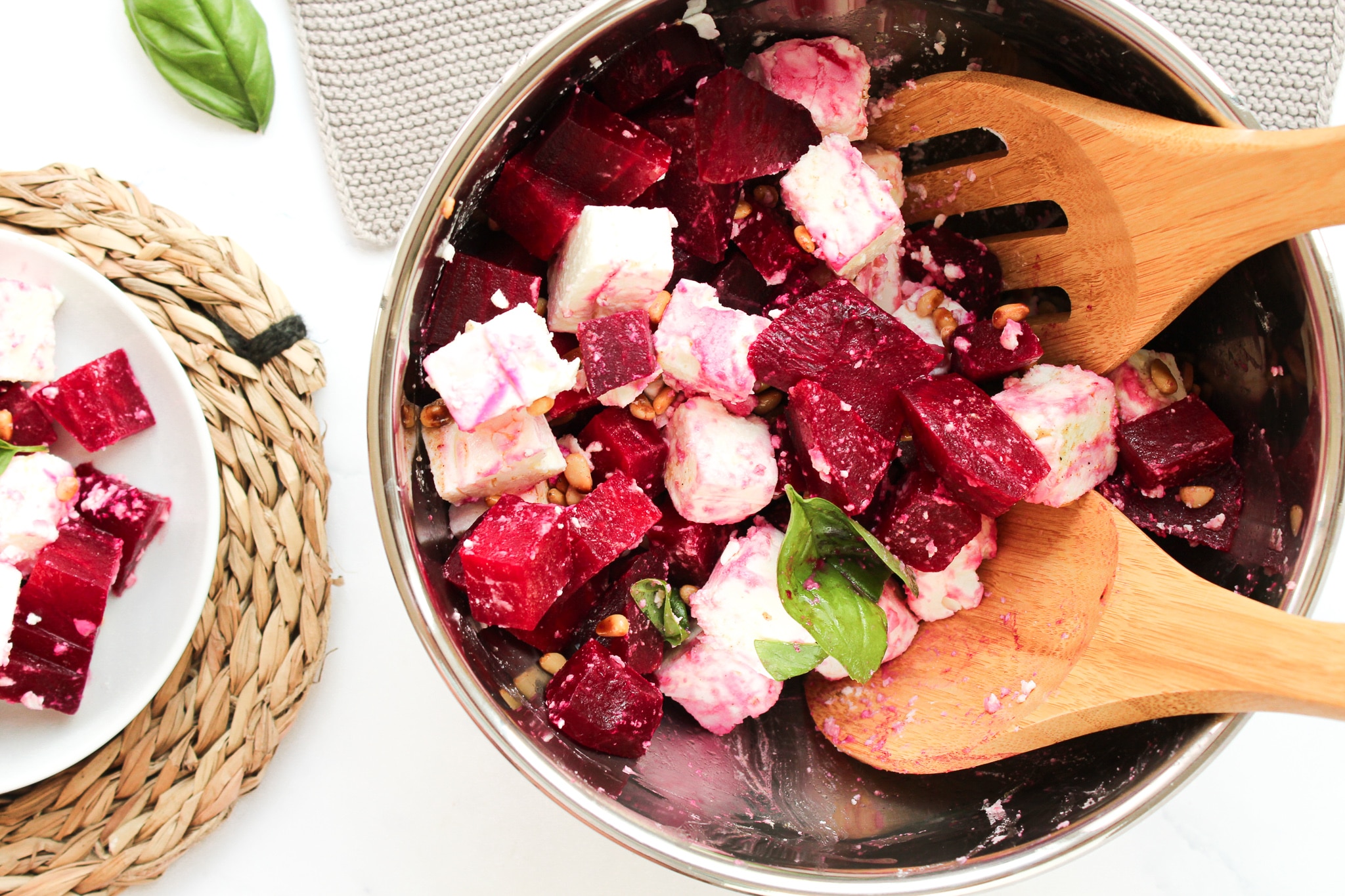 Rote Bete Feta Salat mit Pinienkernen schmeckt nicht nur super und sieht toll aus, die rote Bete ist auch noch sehr gesund. Das Farbenfrohe Wurzelgemüse ist reich an: