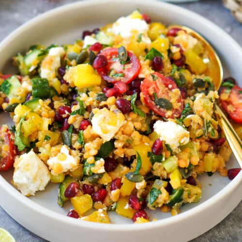 Dieser Rote Linsensalat mit Feta ist super lecker und ganz einfach zuzubereiten. Ob als Snack für die Mittagspause oder als leichte Option für das Abendessen, dieser kunterbunte Salat ist bei mir zu Hause immer sehr beliebt.